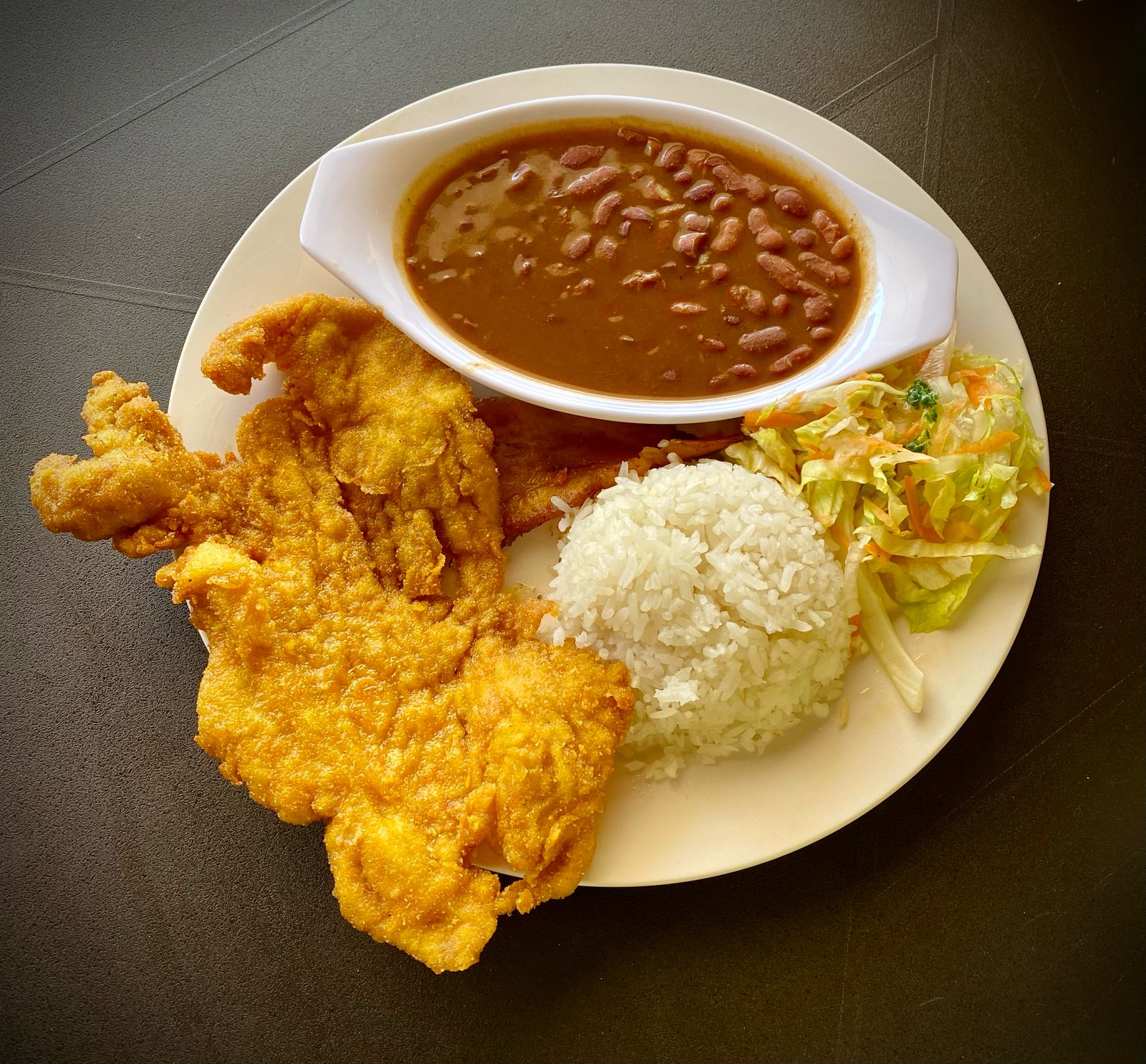 Pieza de pollo frito elige muslo o contramuslo, acompañado de arroz, ensalada, maduro, principio, sopa y bebida.