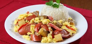 Huevos revueltos con salchicha, acompañado de arroz.