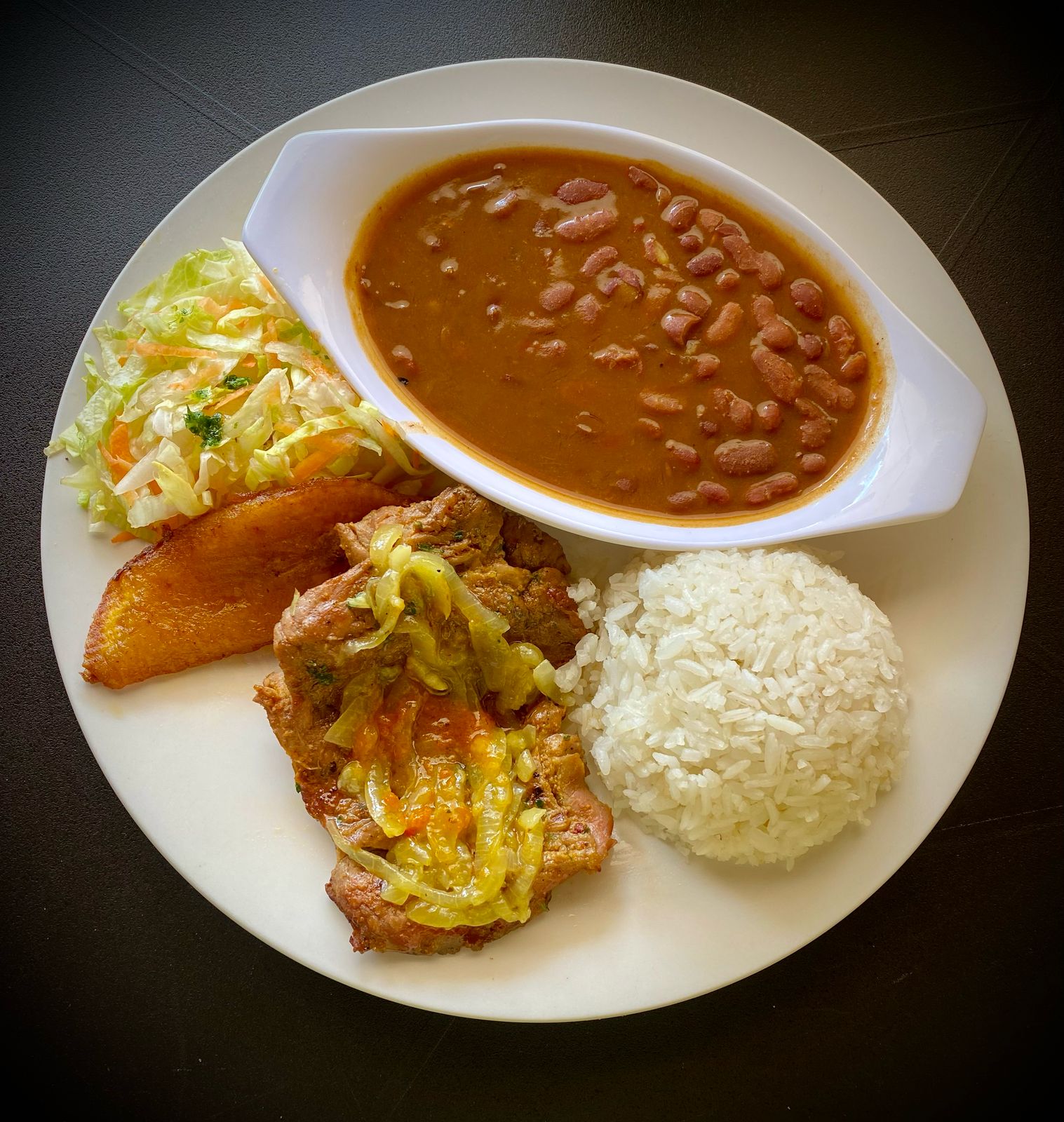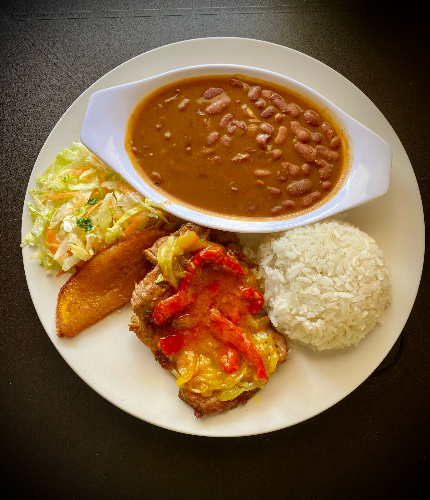 130 g De chuleta de cerdo, acompañado de arroz, ensalada, maduro, principio, sopa y bebida.