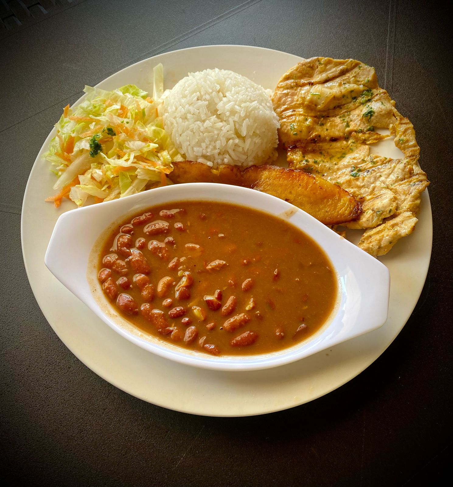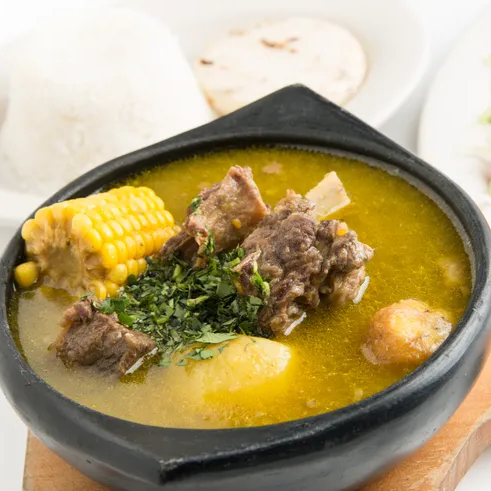 Acompañado de arroz, ensalada, maduro, principio, sopa y bebida.