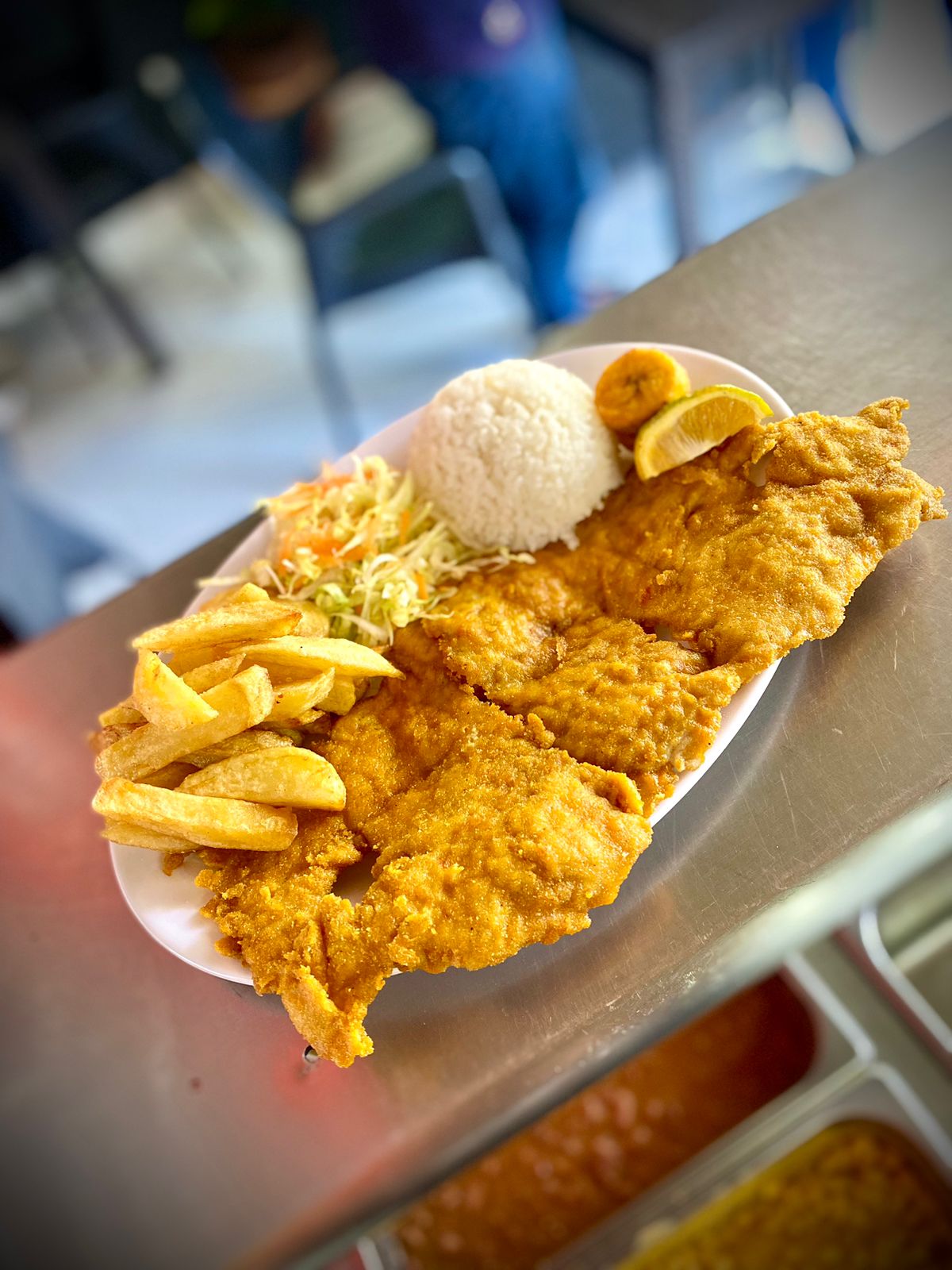 130 g De chuleta de pollo, acompañado de arroz, ensalada, maduro, principio, sopa y bebida.
