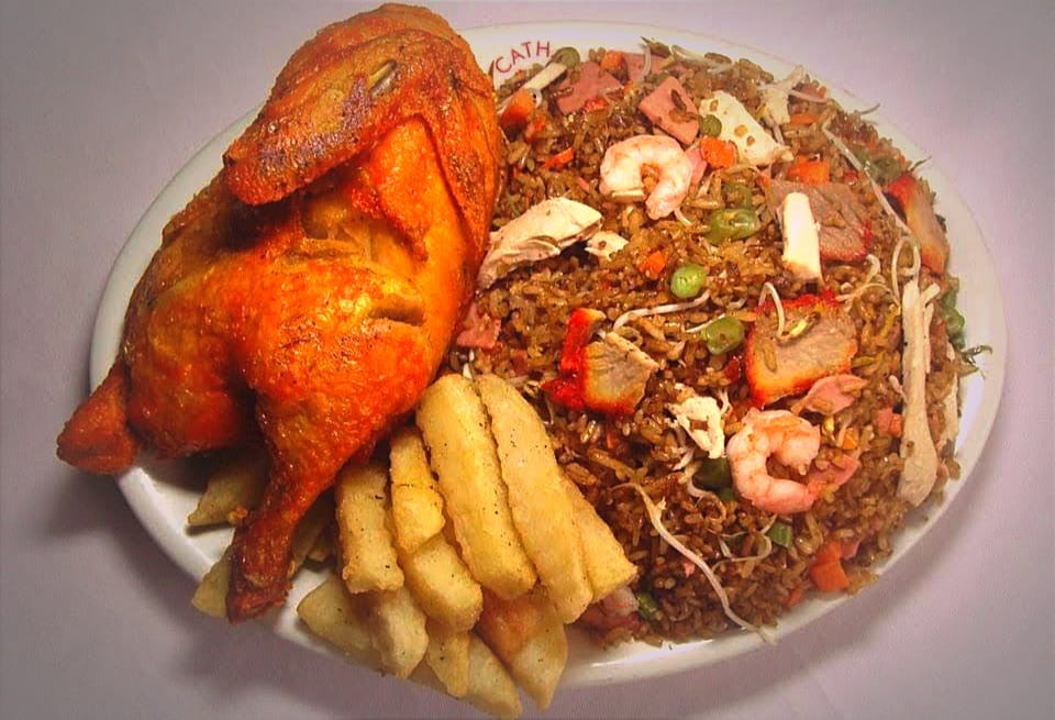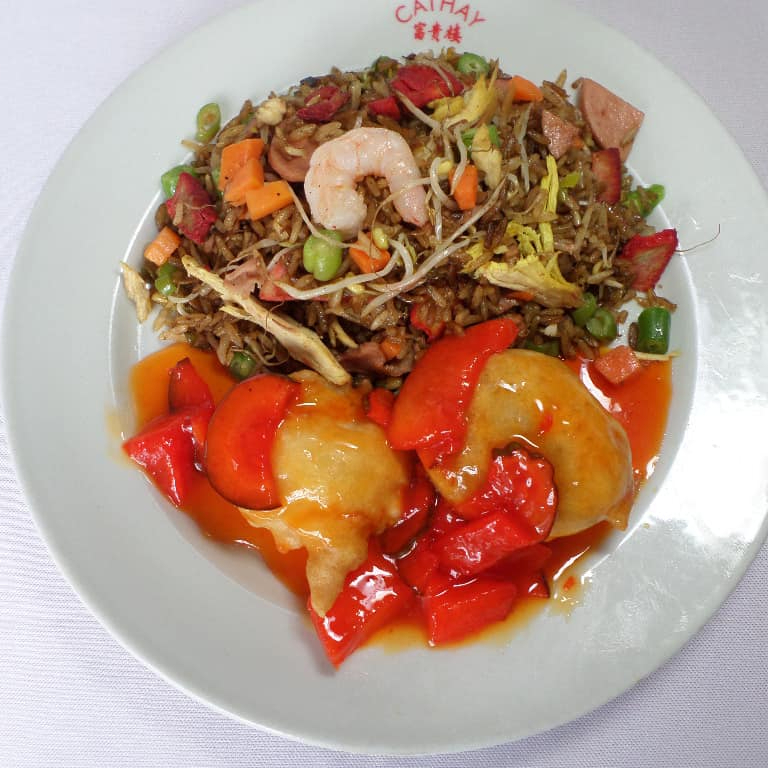 Arroz chino con pollo, jamón, cerdo, camarón, zanahoria, habichuela, raíz china, agridulce de pollo, papas y salsa agridulce