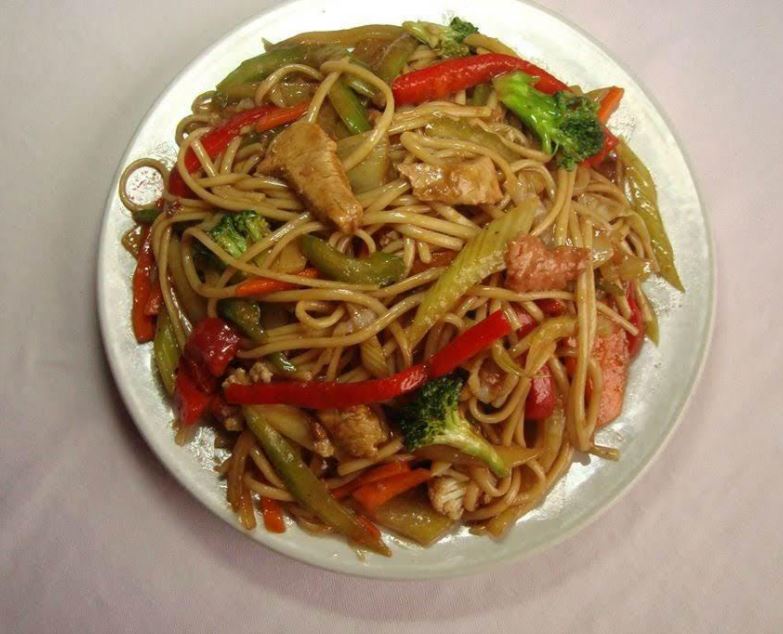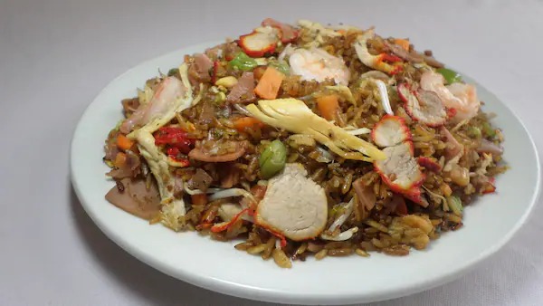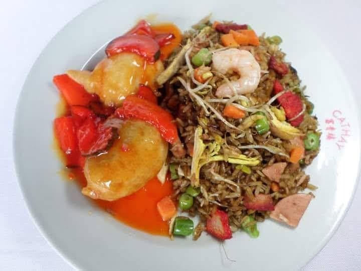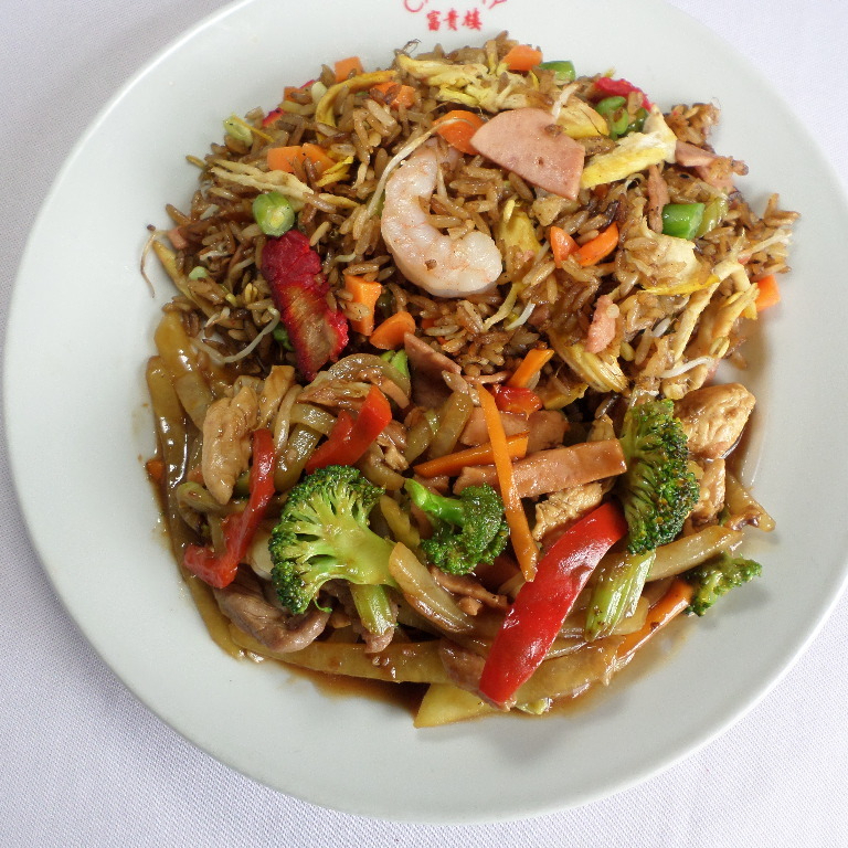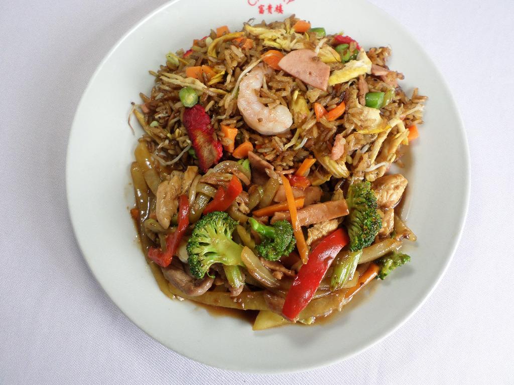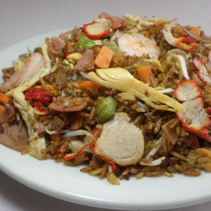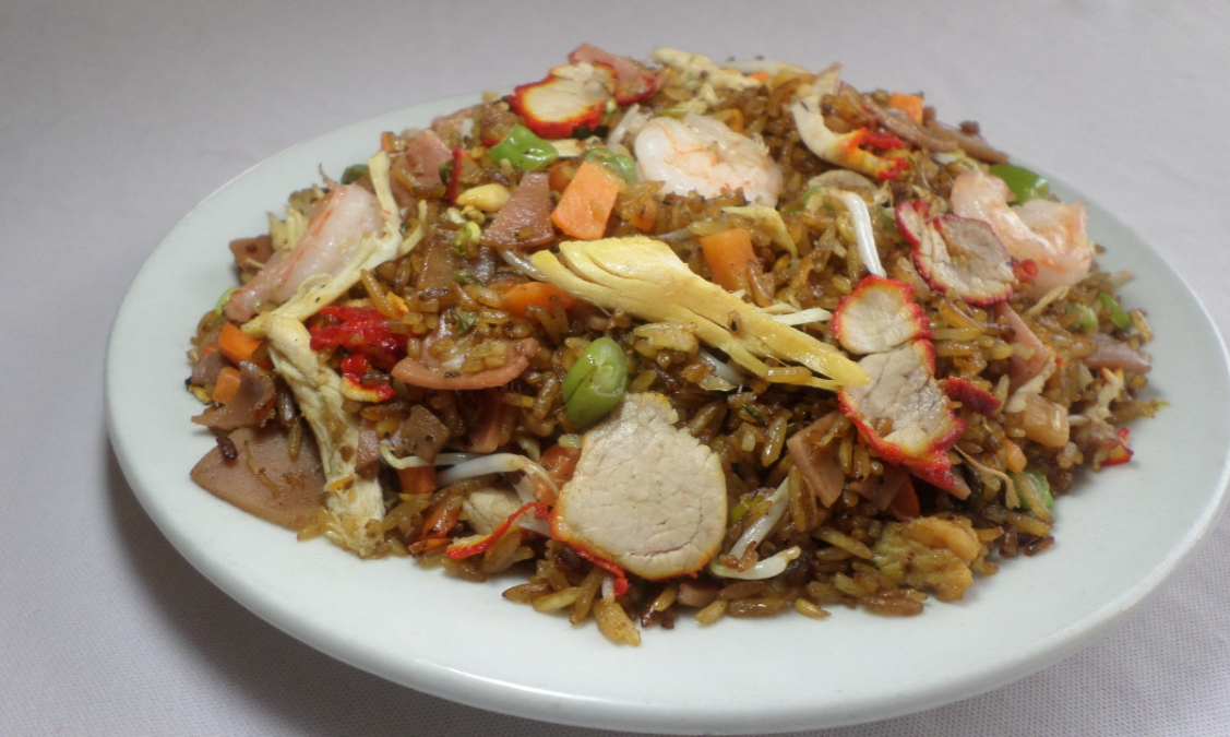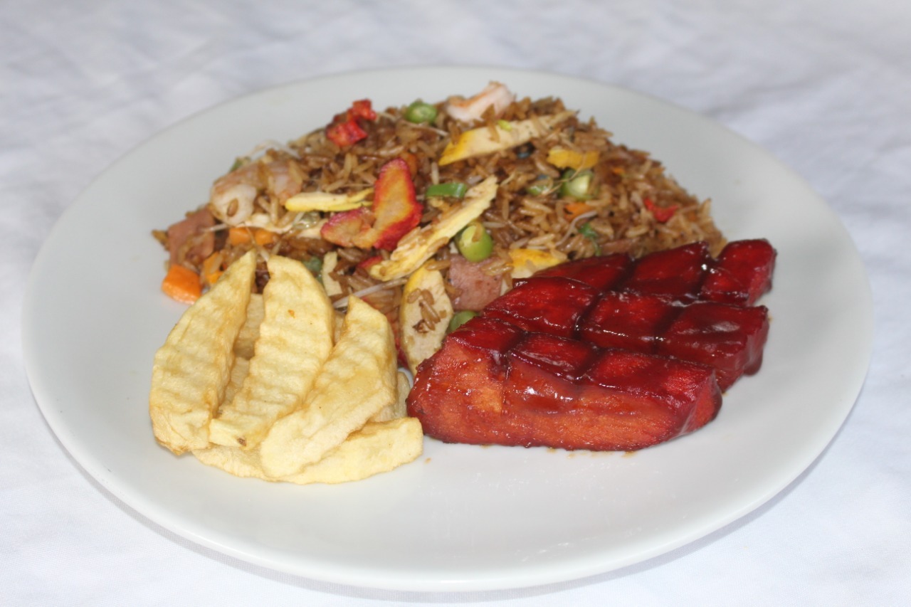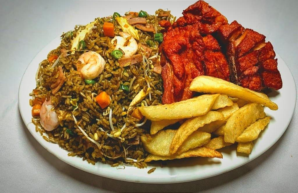 Arroz chino con pollo, jamón, cerdo, camarón, zanahoria, habichuela, raíz china, chopsuey, papas y salsa agridulce