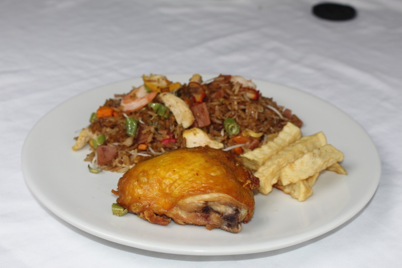 Arroz chino con pollo, jamón, cerdo, camarón, zanahoria, habichuela, raíz china, presa de pollo, papas y salsa agridulce