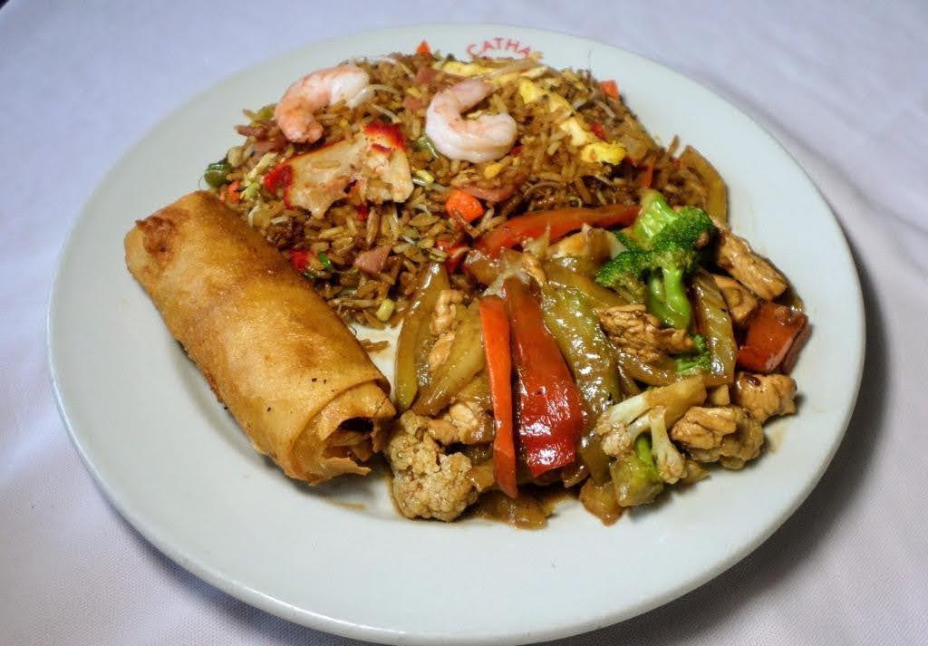 Arroz chino con pollo, jamón, cerdo, camarón, zanahoria, habichuela, raíz china, agridulce de pollo, lumpia, papas y salsa agridulce