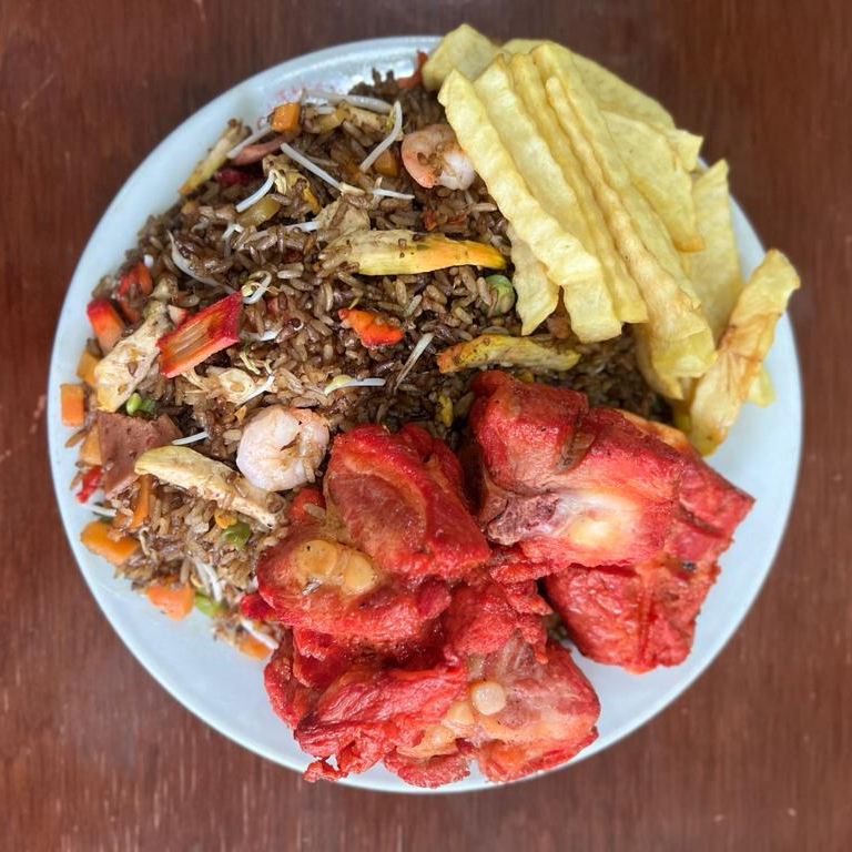 Arroz chino con pollo, jamón, cerdo, camarón, zanahoria, habichuela, raíz china, costilla, papas y salsa agridulce