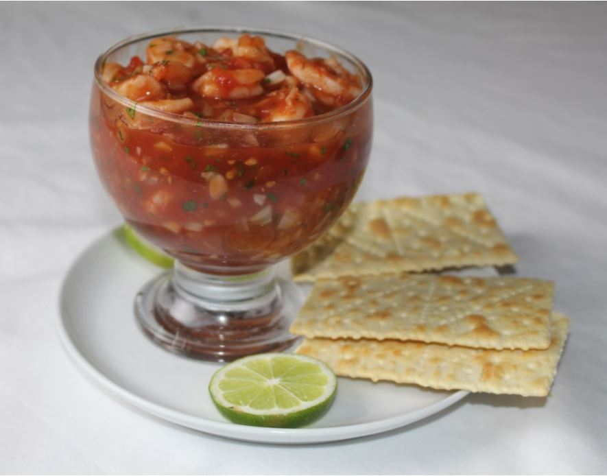 Ceviche con camarones, tomate, cebolla, salsa de tomate, limón, cilantro.