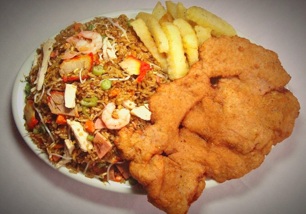 Arroz chino con pollo, jamón, cerdo, camarón, zanahoria, habichuela, raíz china, chuleta de pollo, papas y salsa agridulce