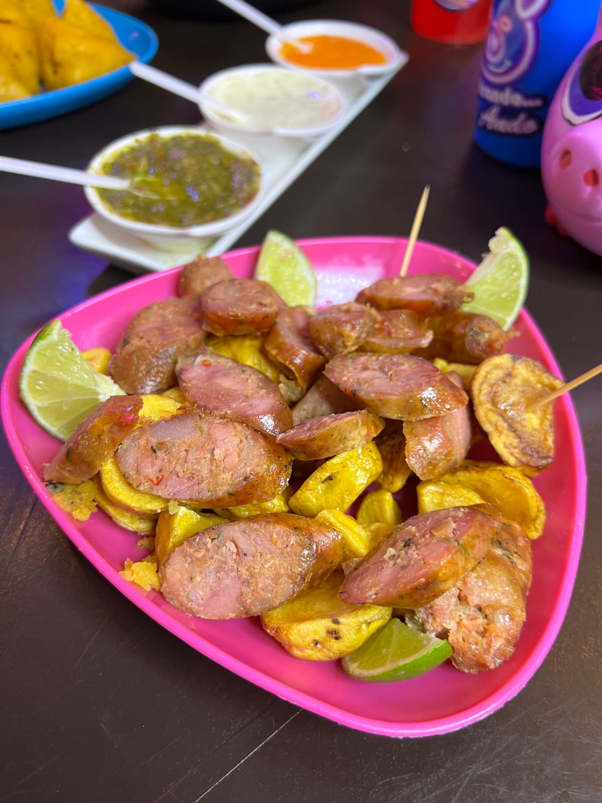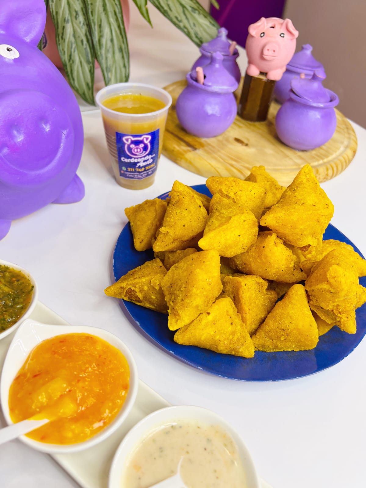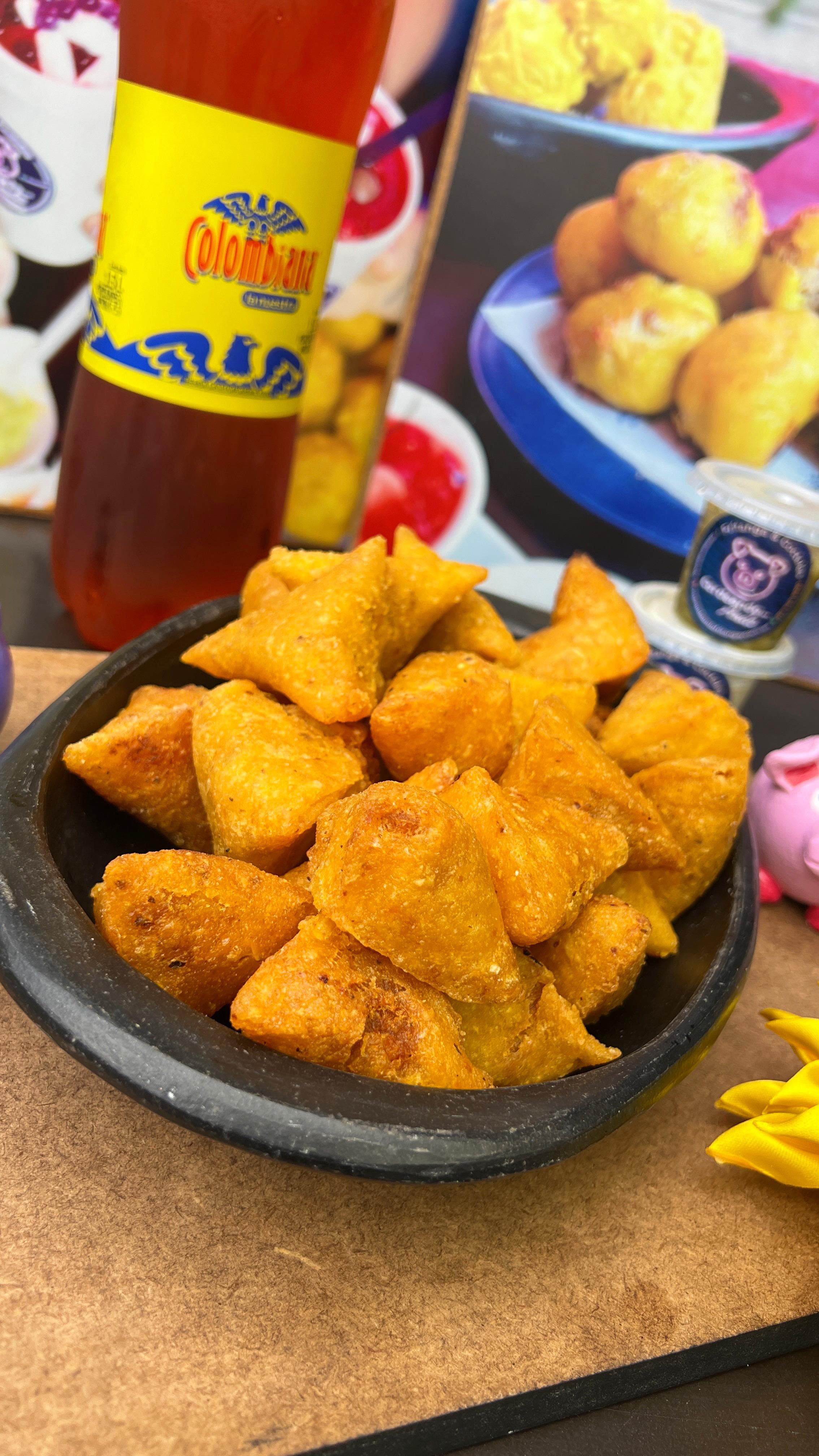 20 empanadas, 8 aborrajados, rellena, chorizo de cerdo, papa amarilla, 1 gaseosa 1.5 y ají surtido