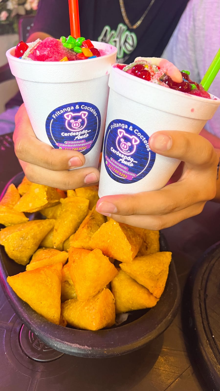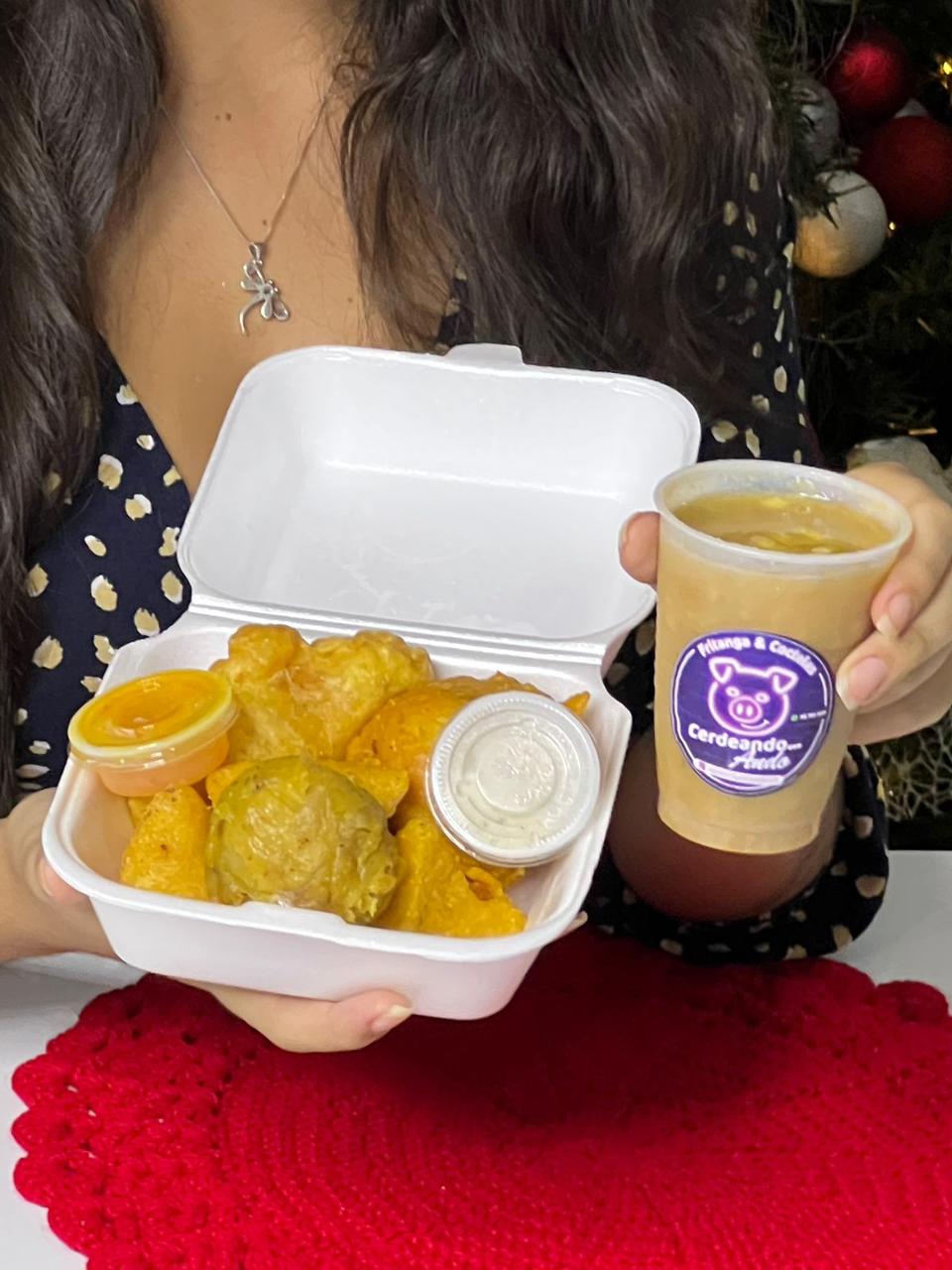 Incluye: 2 empanadas, 1 marranita, 1 maduro, 1 papa rellena, 1 champús (7 oz) y 1 porción de ají o salsas de la casa.