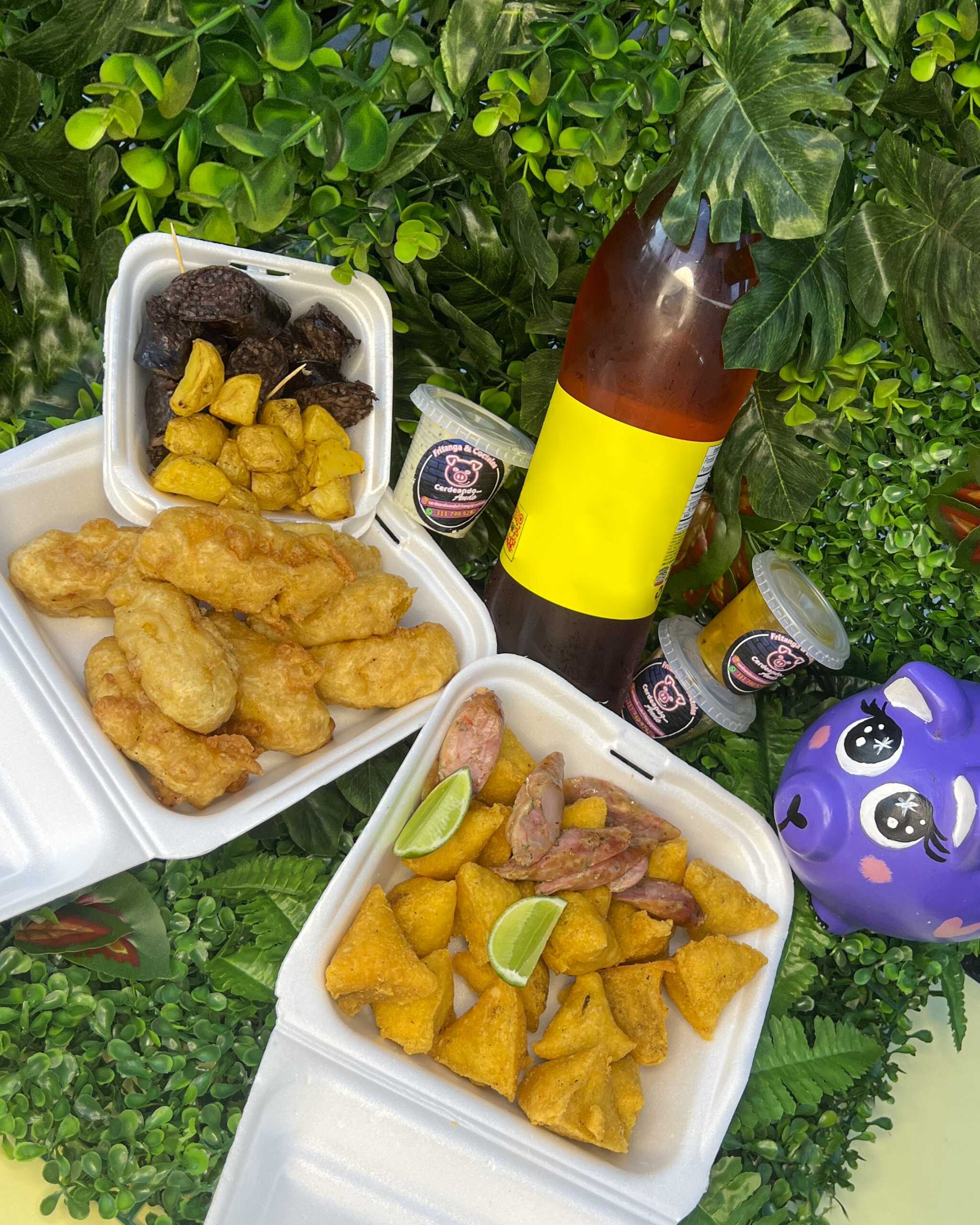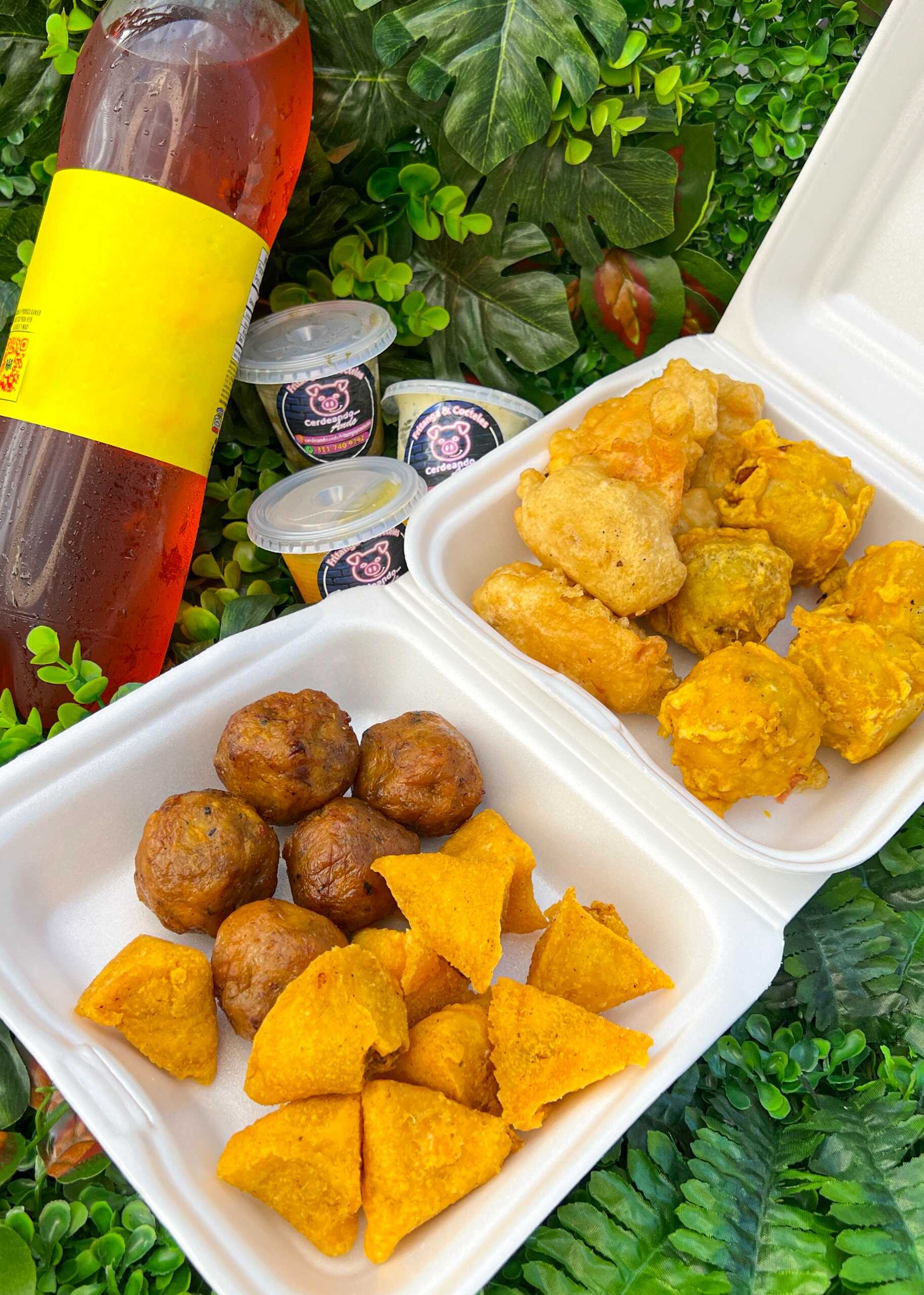 10 empanadas, 5 marranitas, 5 papas rellenas, 5 aborrajados, 1 gaseosa 1.5 y ají surtido