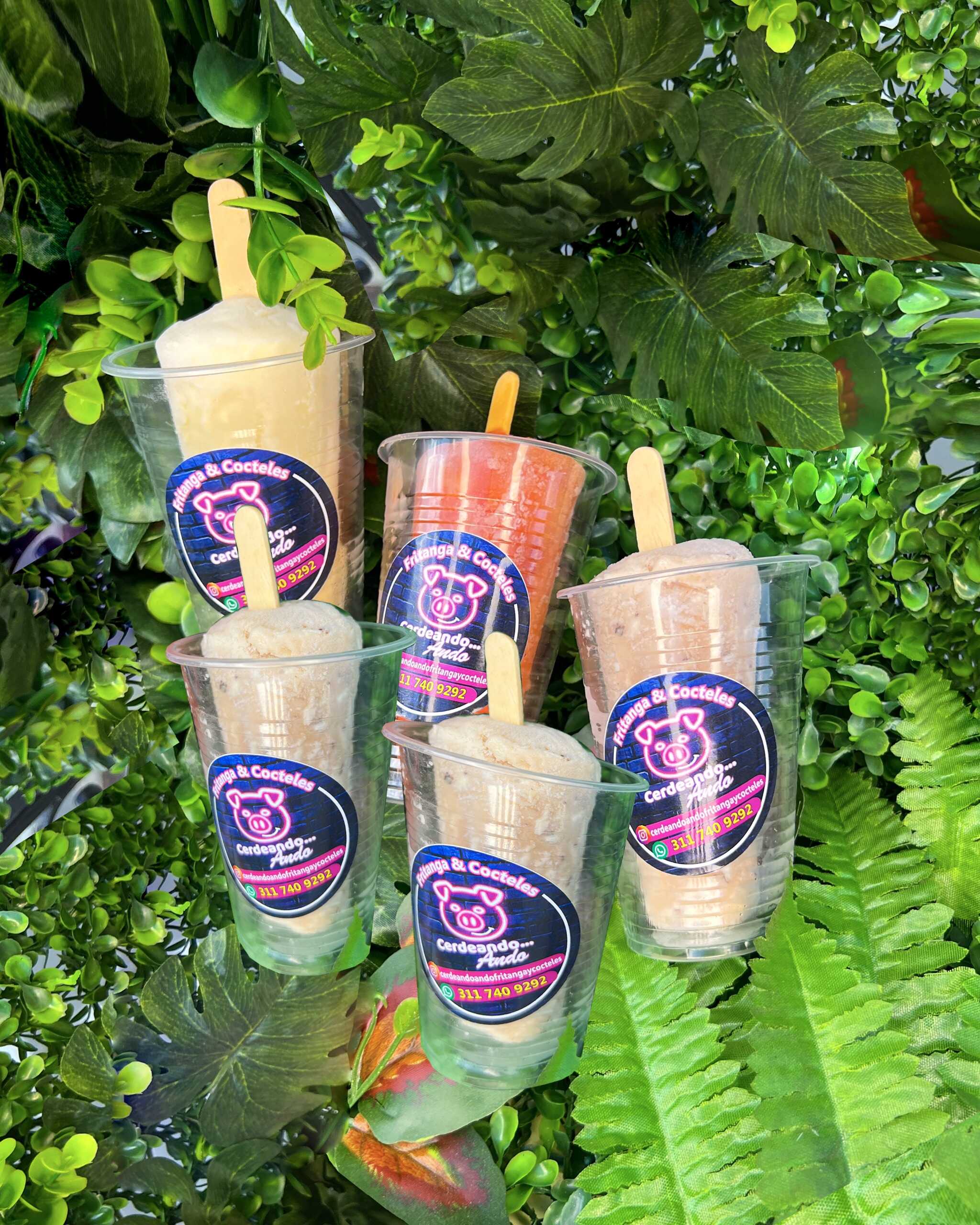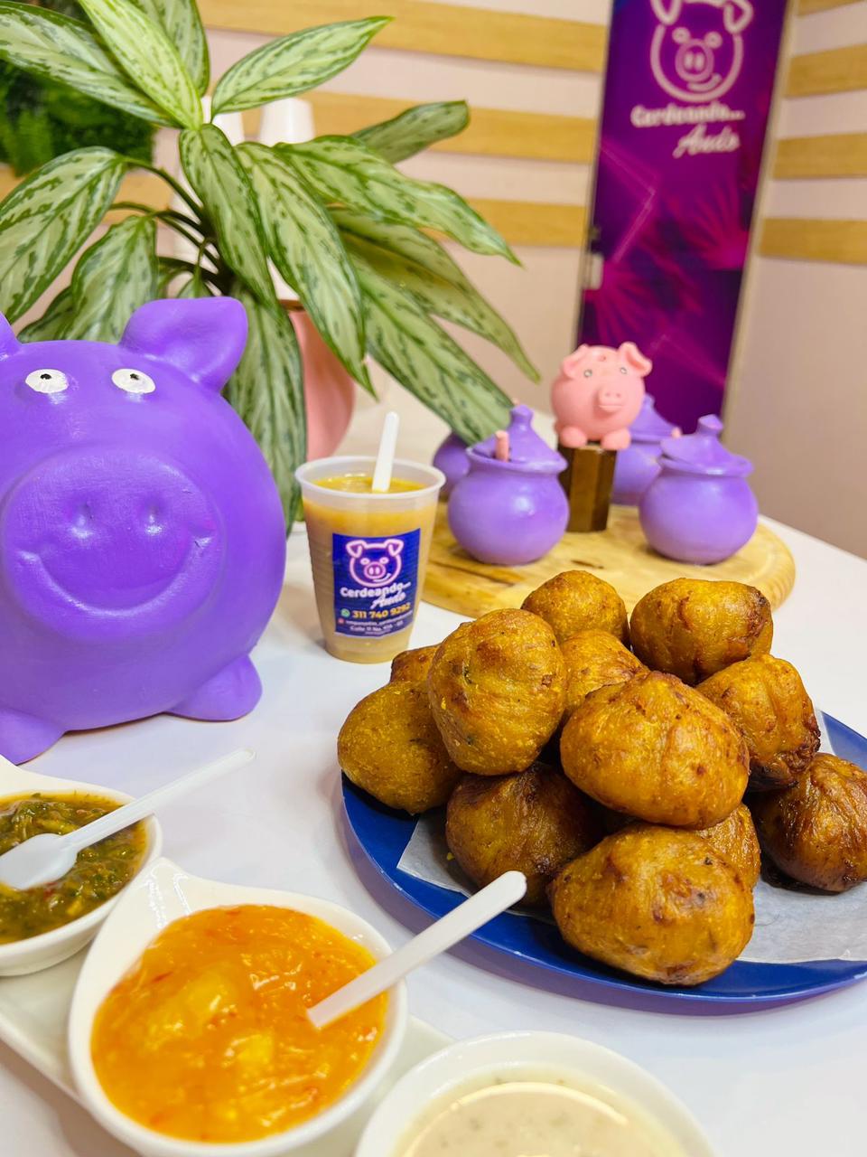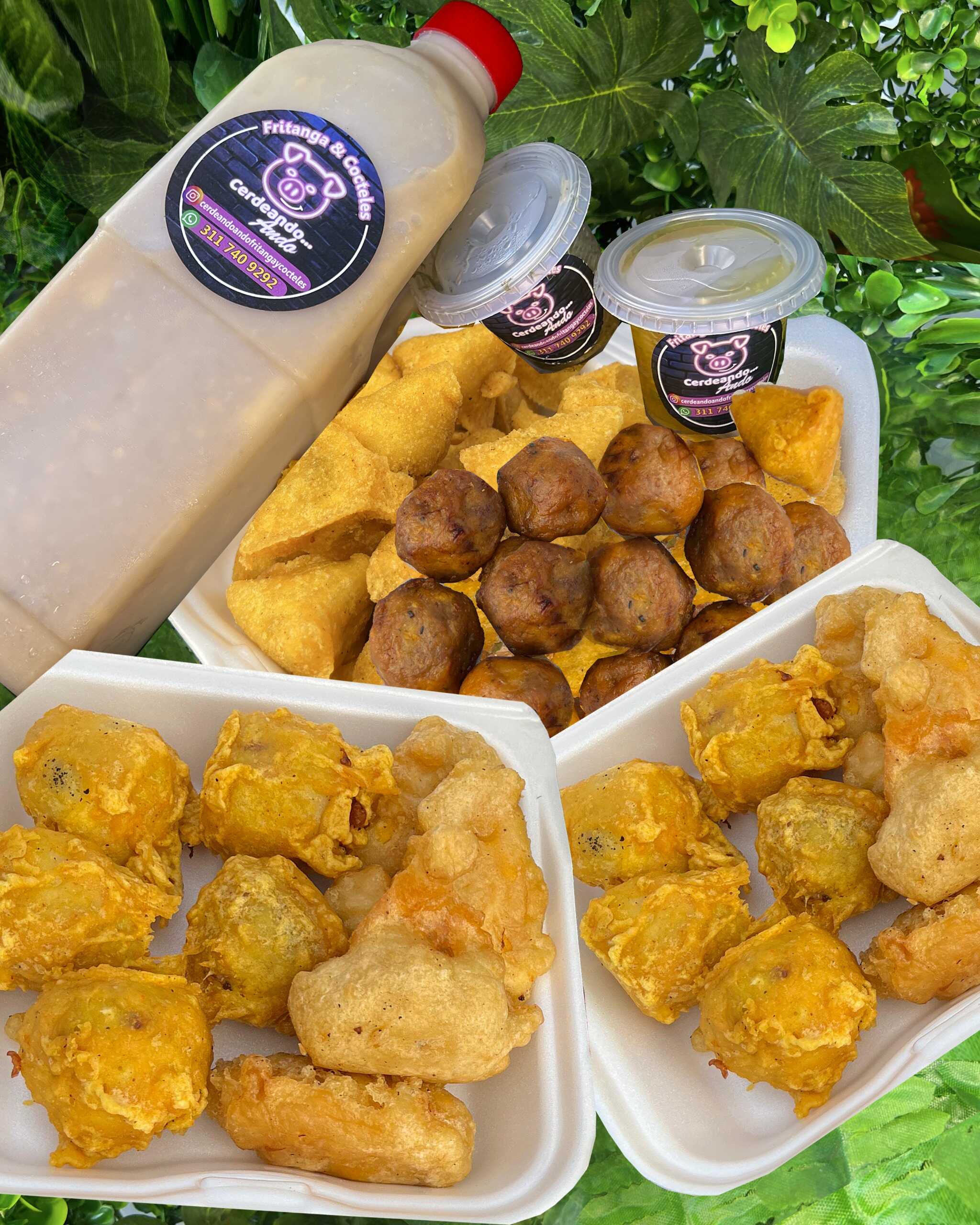 20 empanadas, 5 marranitas, 5 papas rellenas, 5 aborrajados Rellena, Chorizo de cerdo, 1 Champús de 2 litros y 5 helados caseros Ají surtido