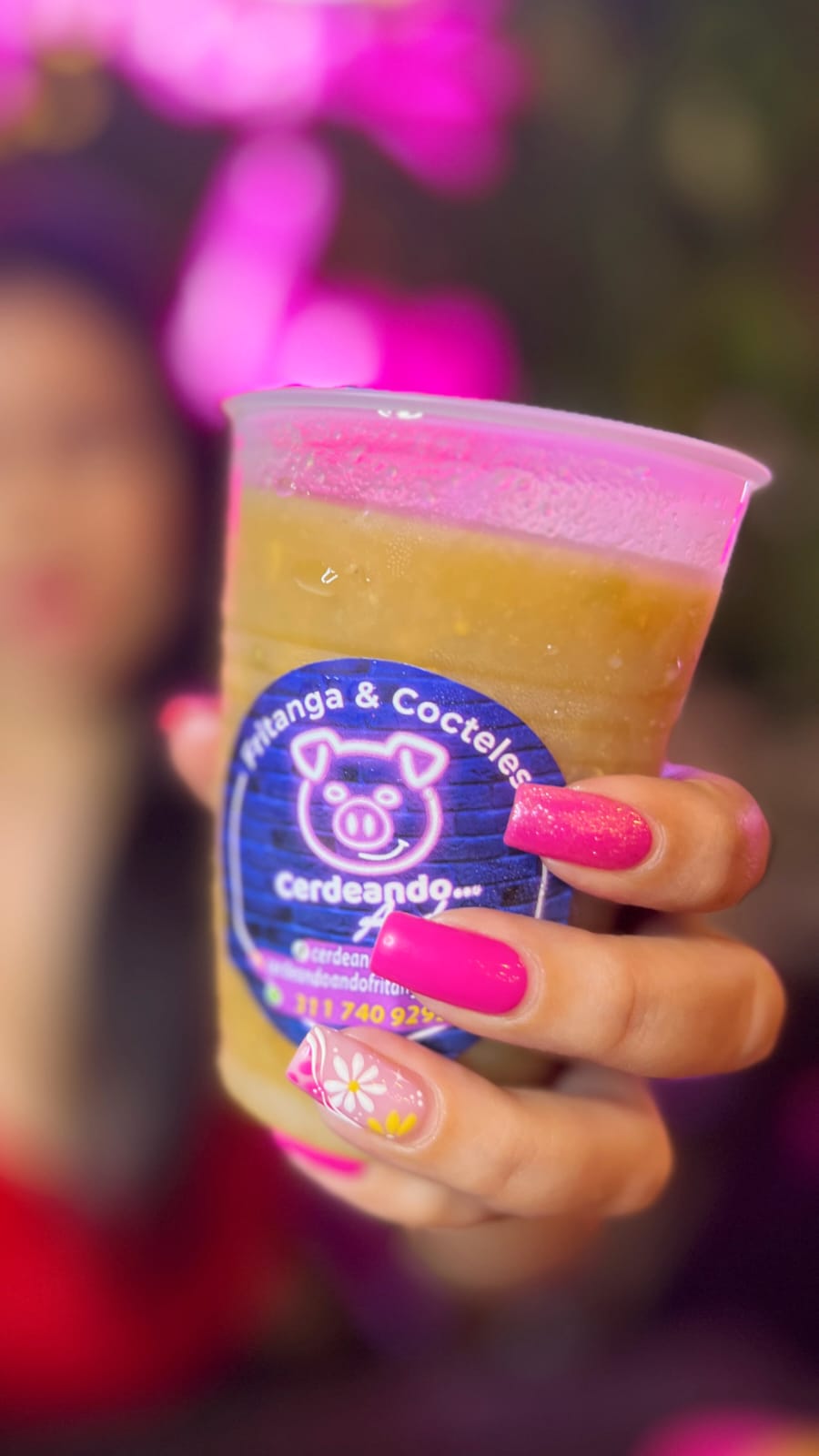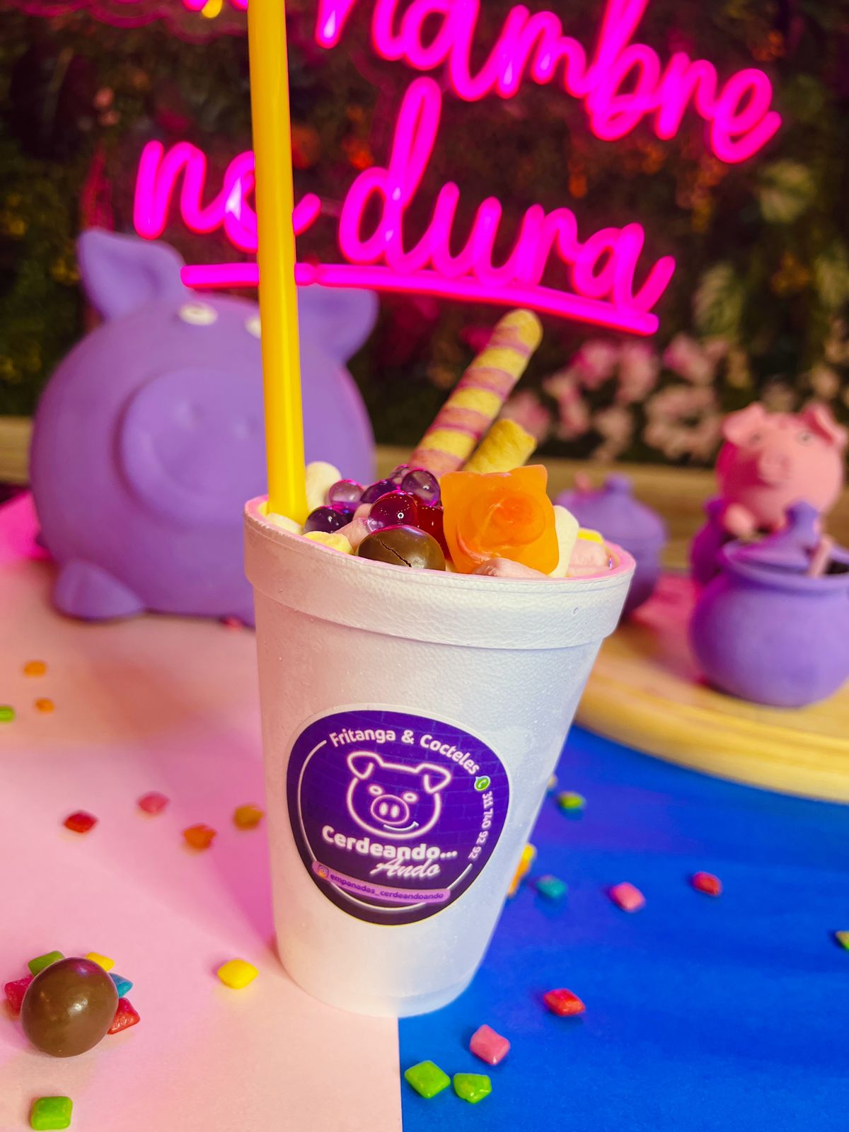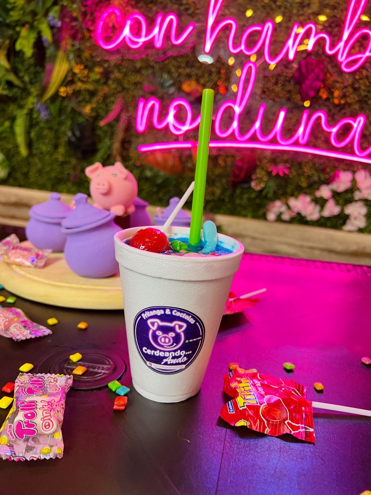 coctel sin licor, sabor a morazul, con gomitas, minichicles y una paleta de dulce