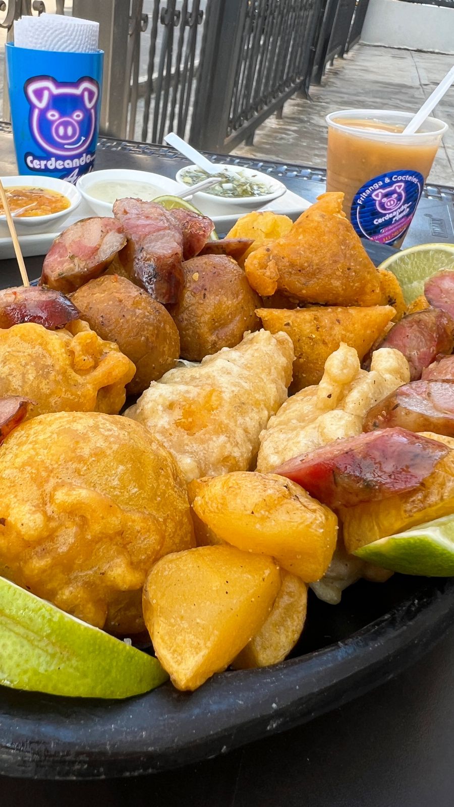 4 empanadas, 2 marranitas, 2 papas rellenas, 2 aborrajados, 2 champús, Chorizo, papa amarilla, Ají y salsa