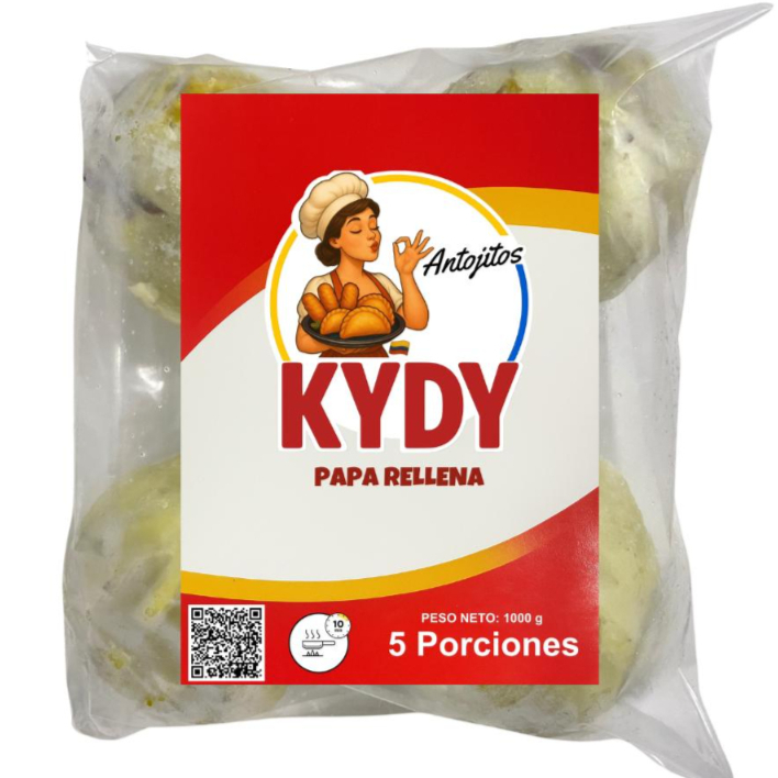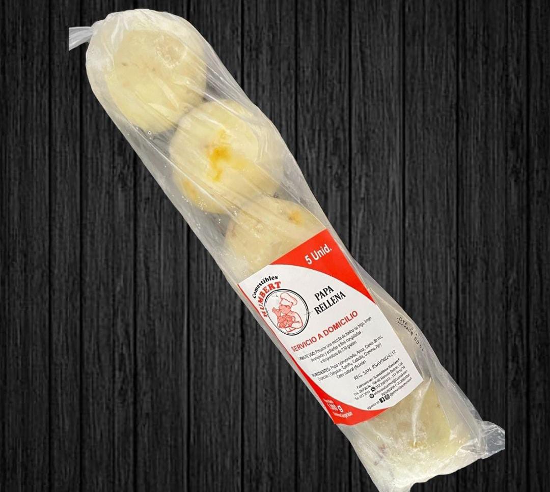 Papa rellena de carne desmechada, arroz y aliños // Preparación: Dejar descongelar por 5 minutos, hacer aborrajado de harina y agua, Freír en suficiente aceite a Fuego medio //para AIR FLAYER: rosearle solo harina de trigo y colocarla a 180° durante 15 minutos// Hornos: aborrajarla o solo rosear harina de trigo (segun preferencia del cliente) colocarlo a 180°/ Se entrega congelado listo para freír