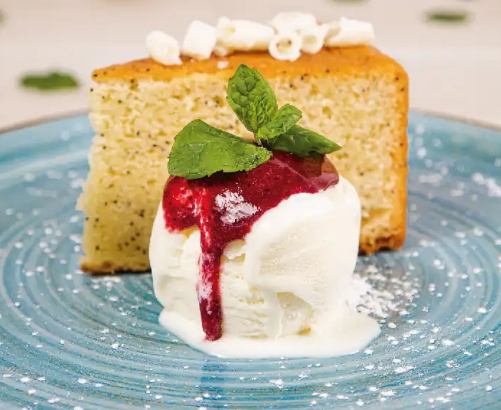 Deliciosa torta de chocolate o vainilla con seimillas de amapola, acompañada con gelato artesanal