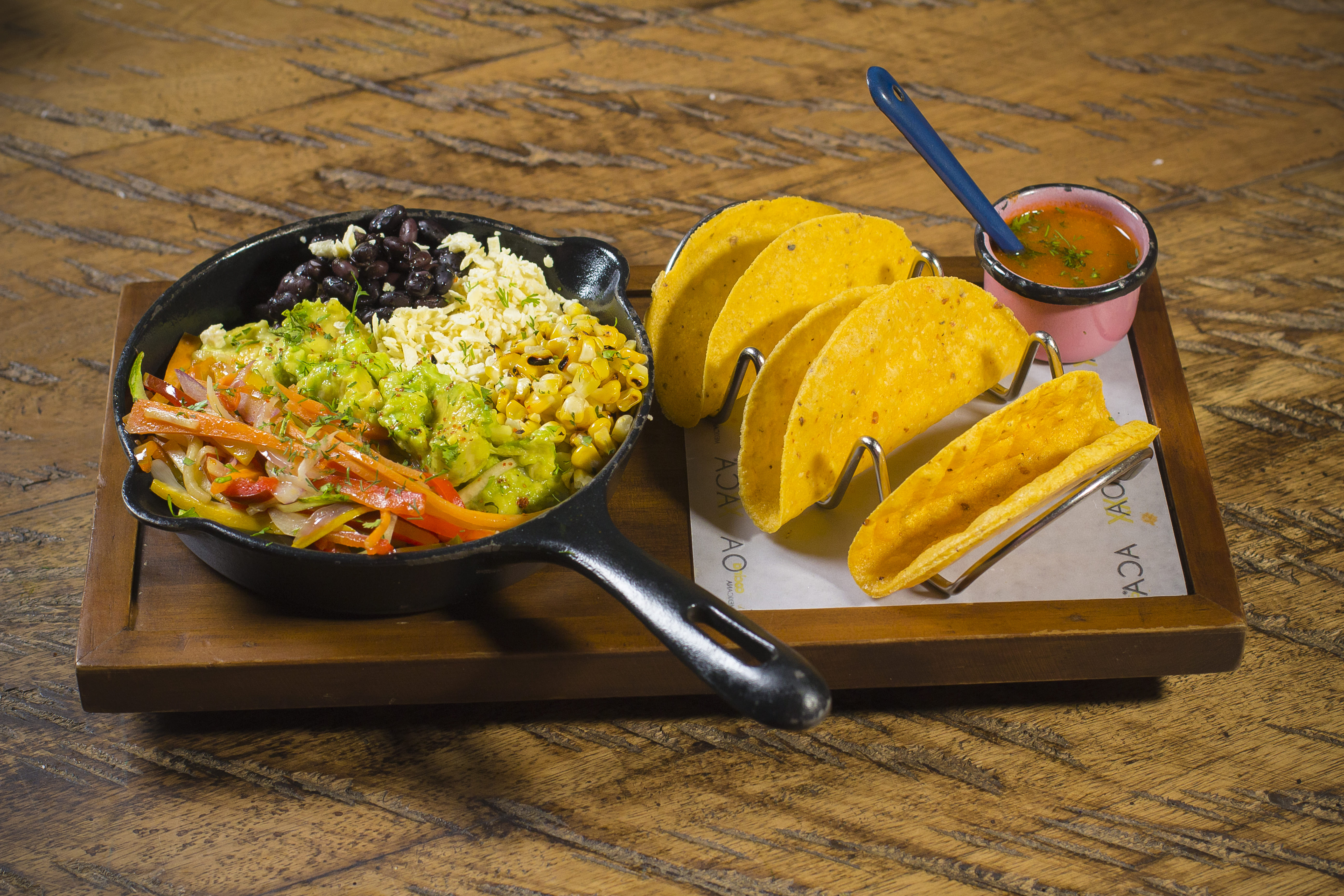 Verduras zarandeadas, guacamole, frijol negro, queso fresco, mazorca dulce, cilantro, salsa ranchera roja y lechuga batavia.