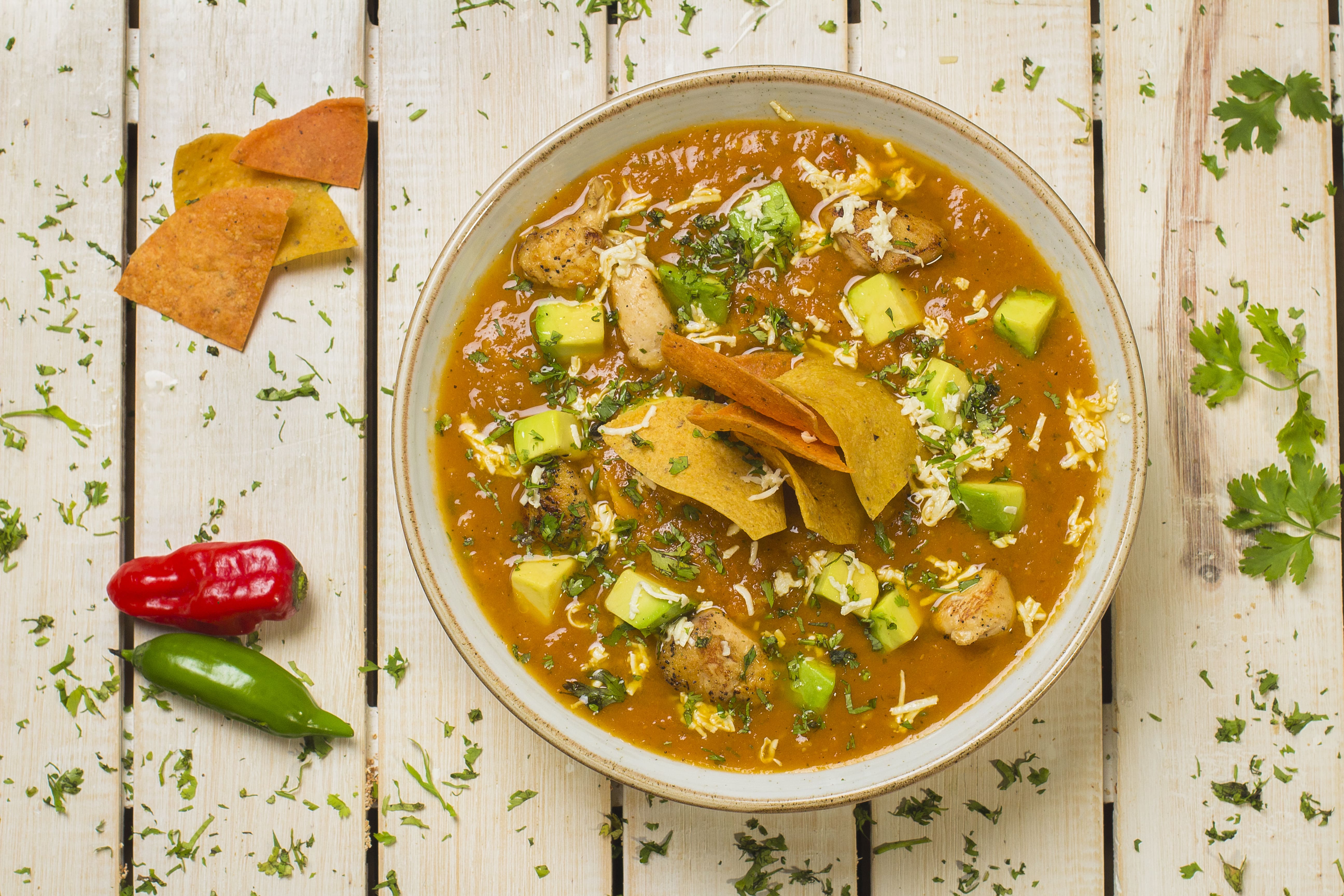 Pollo en trozos, jitomate maduro asado a la parrilla, chile ancho, aguacate, cebolla, queso fresco, cilantro y totopos