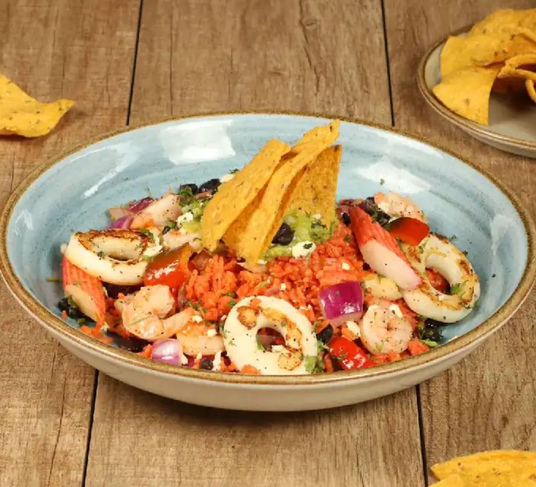 Nuestra selección especial de frutos del mar, arroz mexicano, cebolla morada, pimentón, salsa ranchera roja, frijol caraota, queso fresco, guacamole, cilantro y totopos.