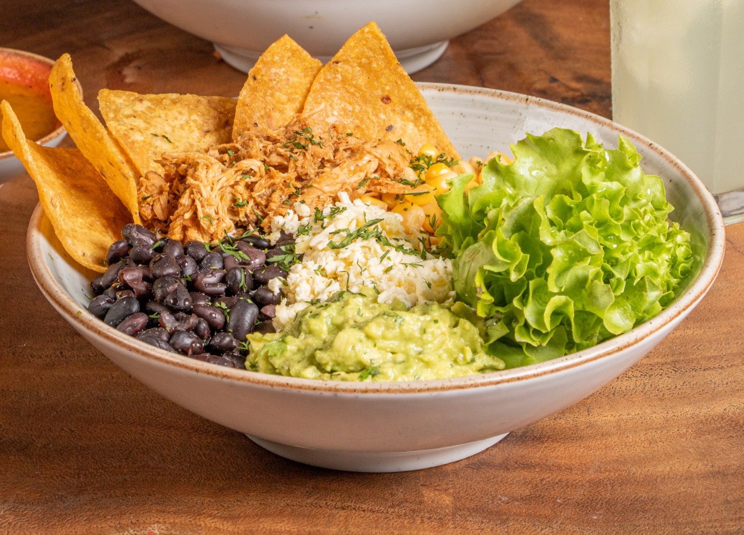 Arroz mexicano, frijol caraota, guacamole, maíz tierno, res deshebrada, mix de lechuga, cilantro, acompañado de totopos de maíz.