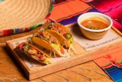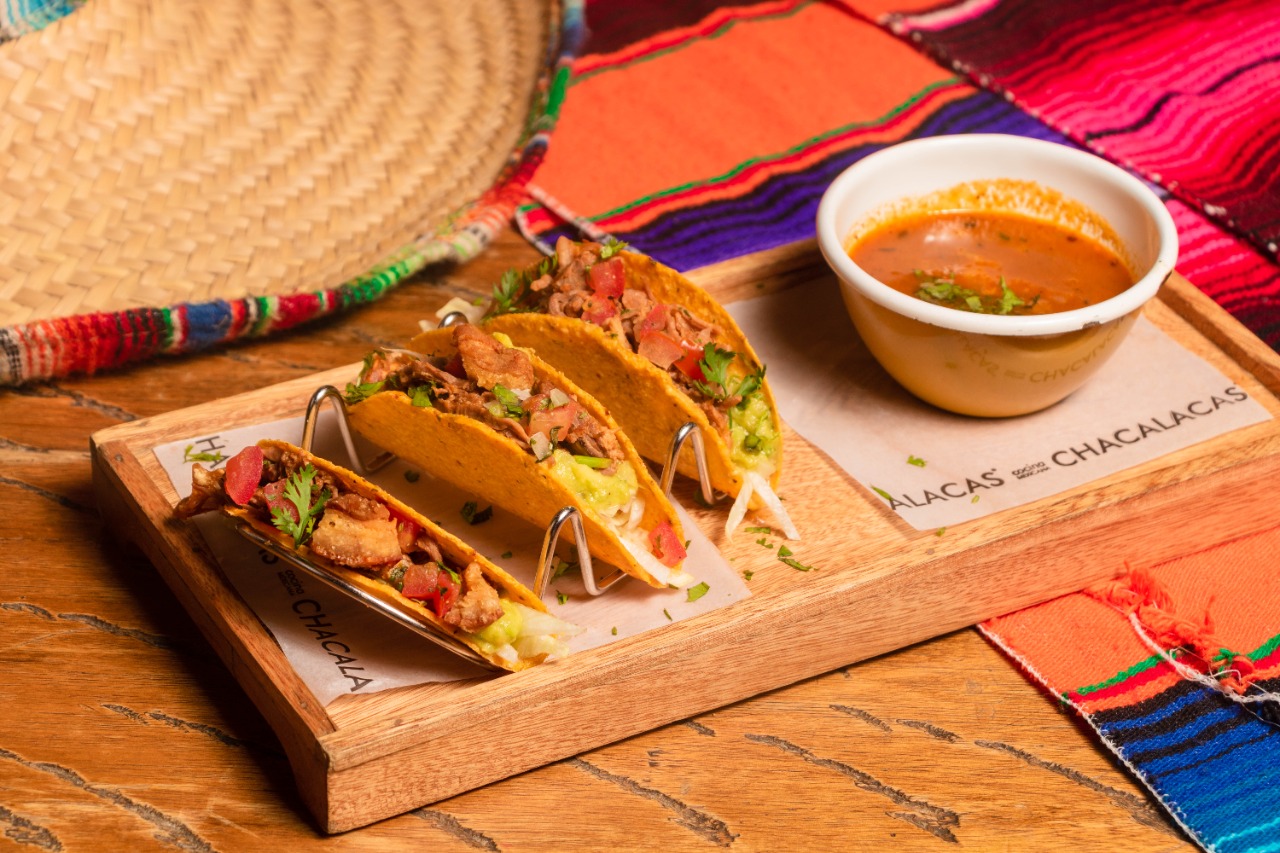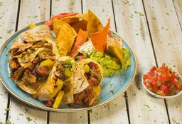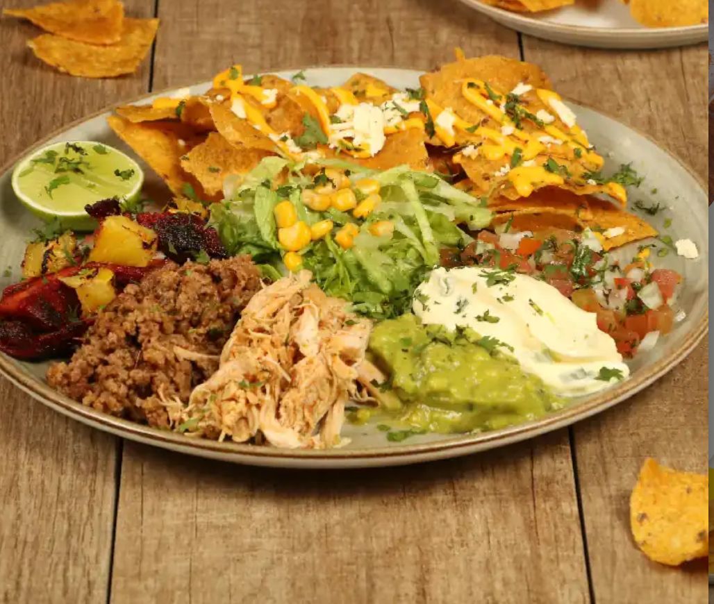 Pollo, cerdo al pastor, carne de res molida, guacamole, pico de gallo, sour cream, lechuga batavia, maíz dulce. Acompañado de totopos con cheddar, queso fresco y limon. + bebida