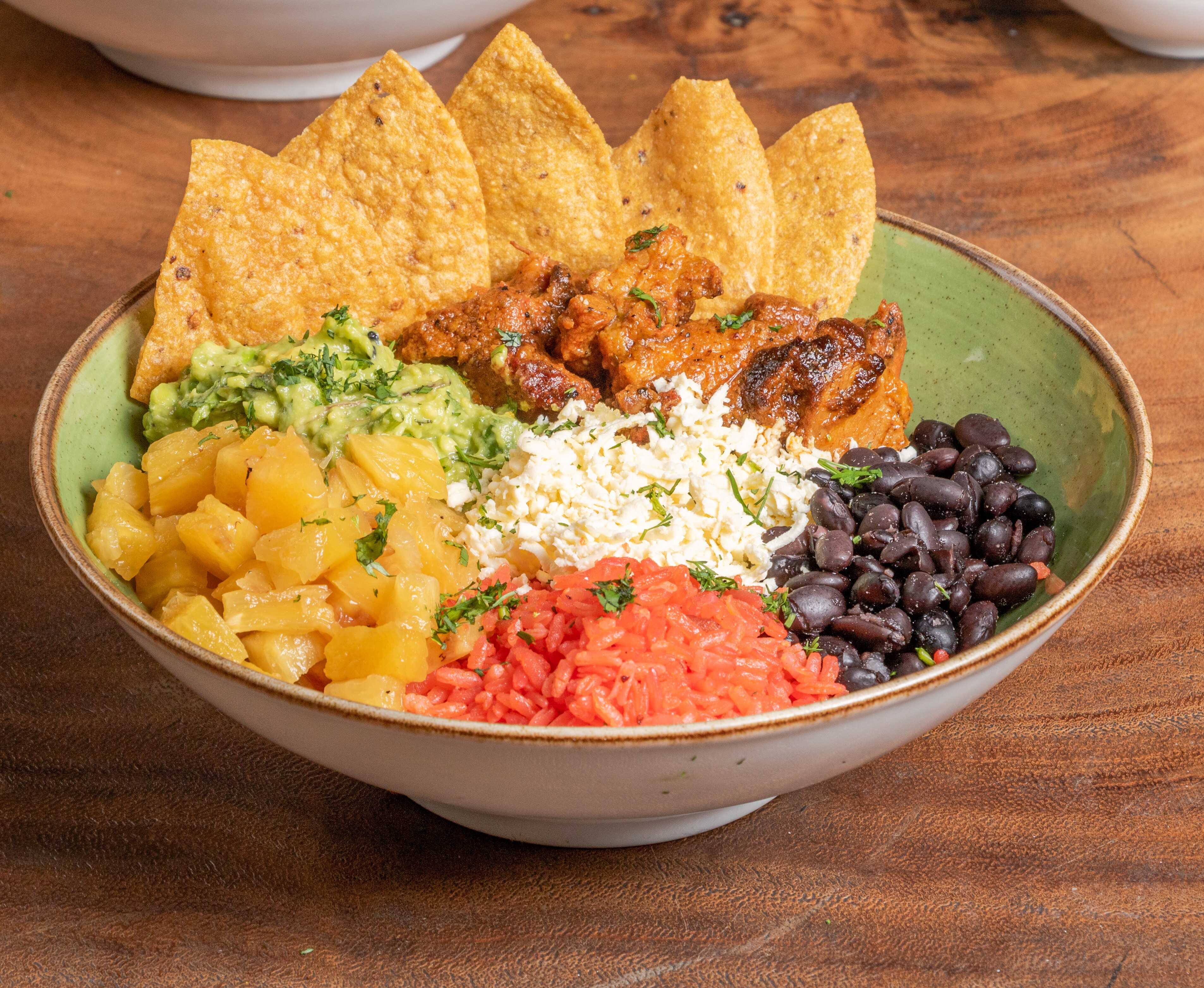 Arroz mexicano, frijol caraota, guacamole, piña a la parrilla, cerdo al pastor bañadO en salsa ranchera roja, mix de lechuga, cilantro, acompañado de totopos de maíz.