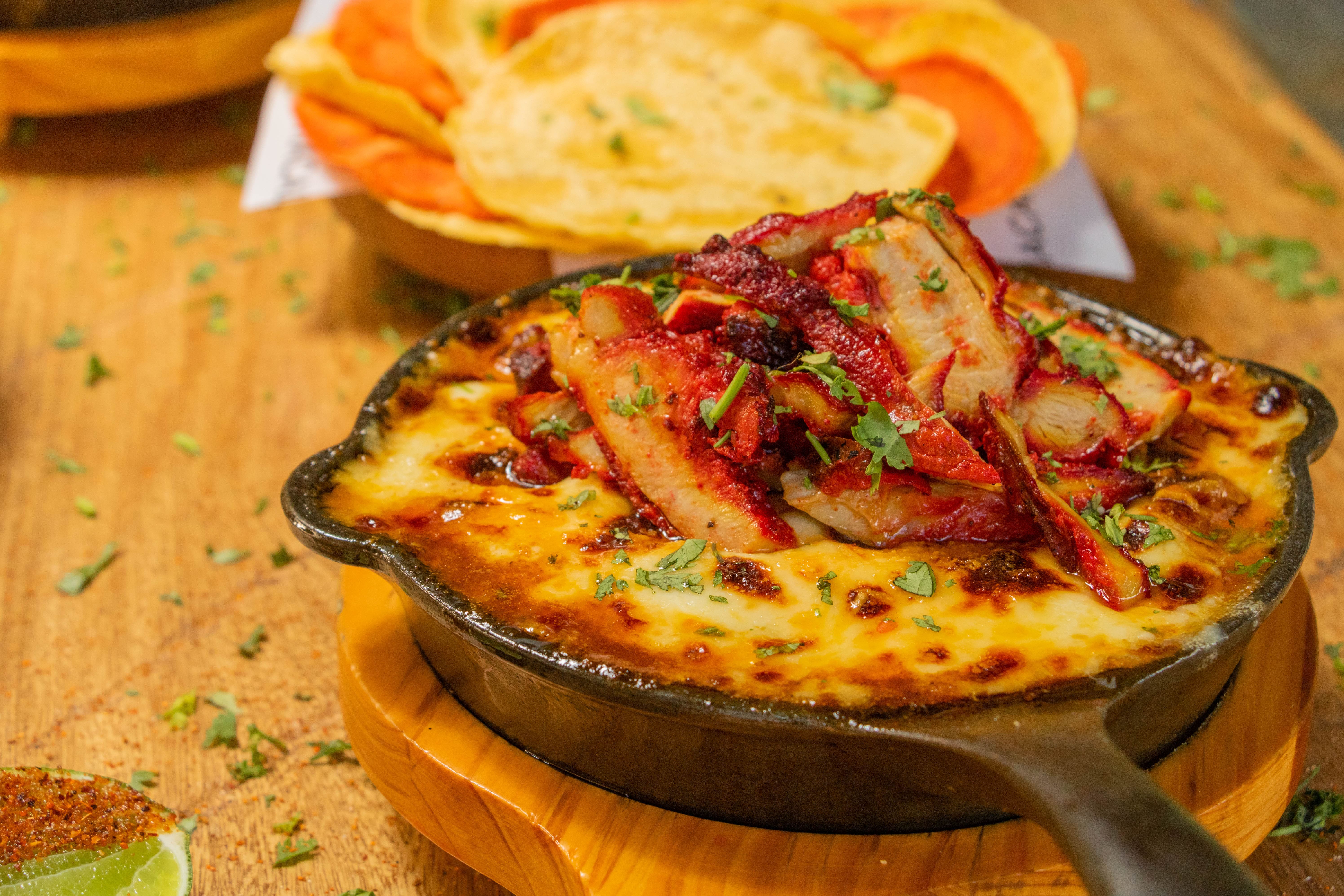 Carne de res deshebrada, salsa ranchera roja, chicharrón, maíz dulce, crema de leche y cilantro gratinado con queso mozzarella y parmesano. Acompañado de tortillas de maíz y limón.