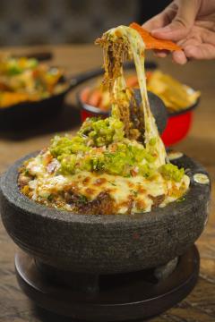 Res, pollo o cerdo deshebrado, chicharrón, refrito de frijol, salsa ranchera roja, gratinado con queso mozzarella y parmesano, pico de gallo, guacamole y cilantro. Acompañado de totopos (Sugerido para 2 o 3 personas).