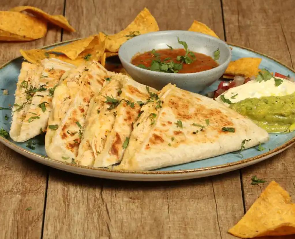 Tortilla de harina rellena con queso mozzarella y pollo desmechado. Acompañada de guacamole, sour cream, pico de gallo, salsa ranchera roja, cilantro y totopos.