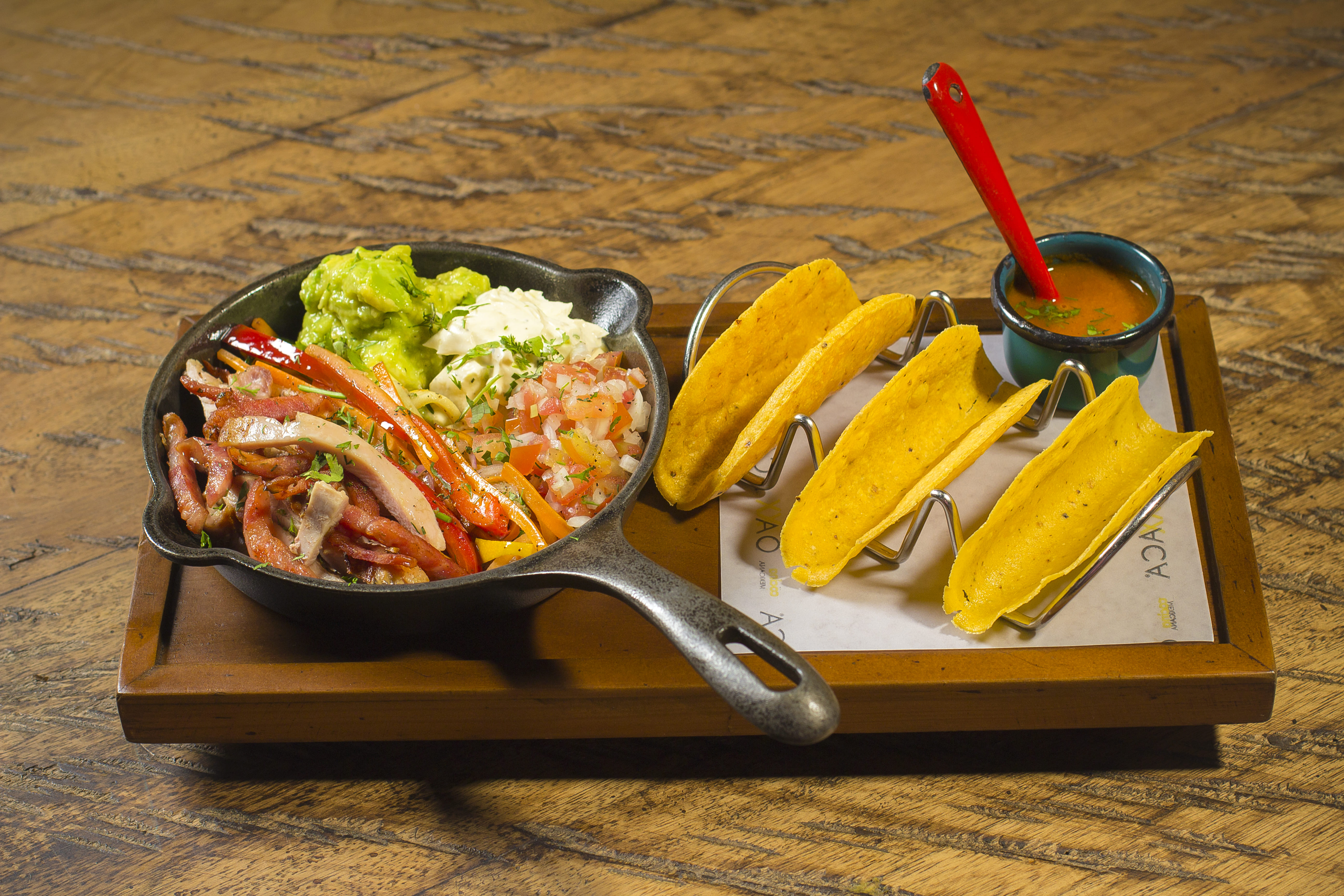 Entremuslo de pollo a la parrilla, chorizo, verduras zarandeadas, guacamole, pico de gallo, sour cream, cilantro, salsa ranchera roja y lechuga batavia.