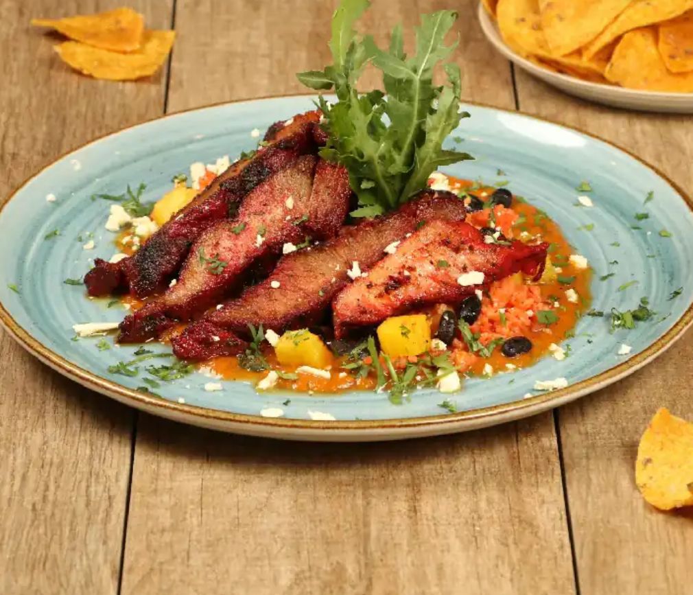 Bondiola de cerdo al pastor, salsa ranchera roja, piña a la parrilla, frijol caraota, arroz mexicano, rúgula, queso fresco y cilantro.