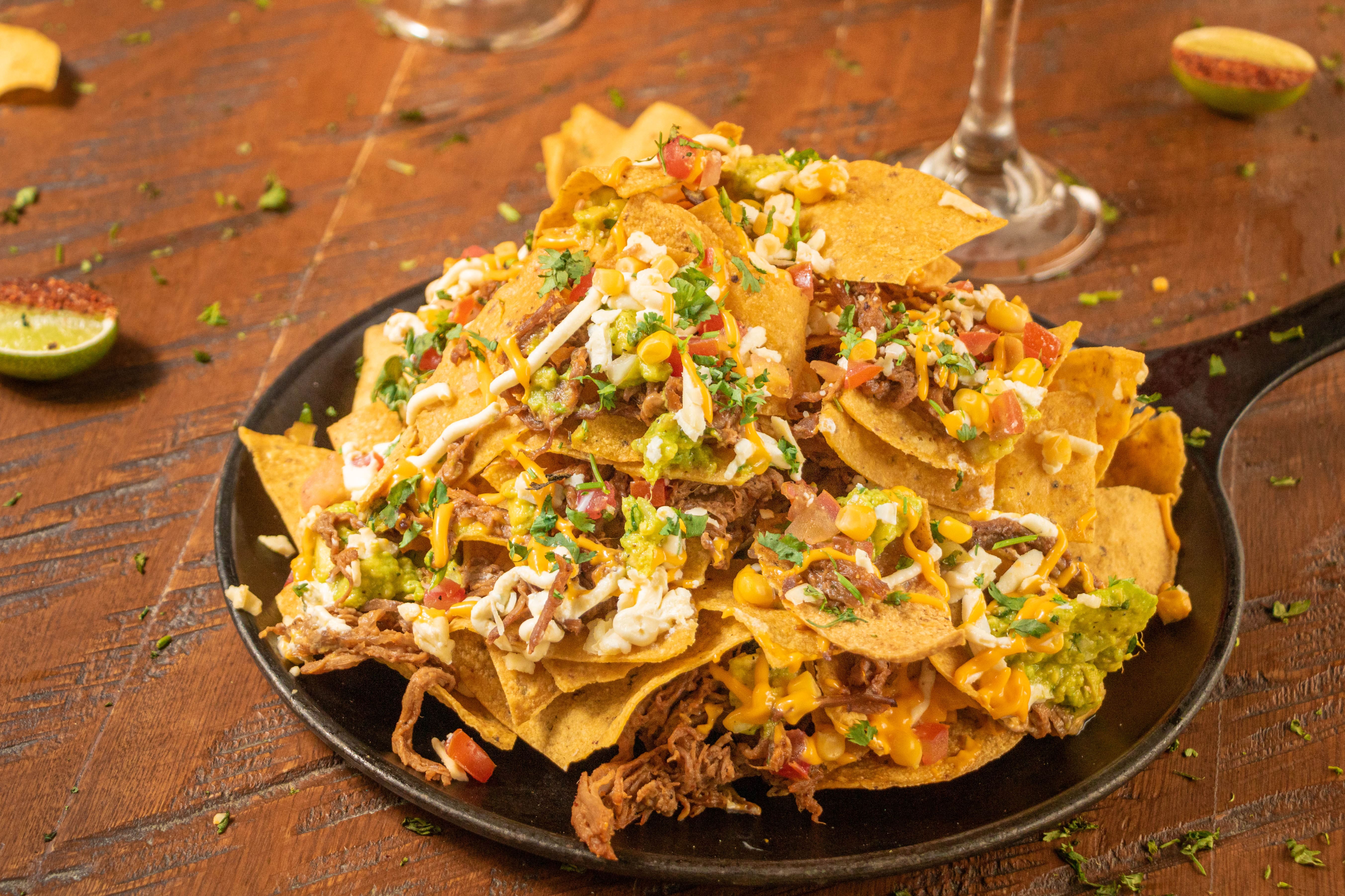 Res deshebrada con totopos, acompañados de queso fresco, pico de gallo, maíz dulce, guacamole y cilantro, bañados en salsa sour cream y salsa cheddar (sugerido para 2 personas).