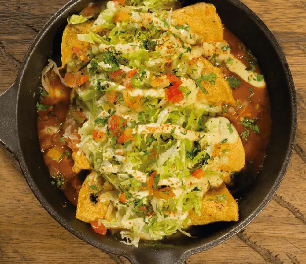 Tortillas de maíz rellenas de carne deshebrada, bañadas en salsa ranchera roja, gratinadas con queso mozzarella. Acompañadas de lechuga batavia, queso fresco, pico de gallo, sour cream, cilantro y tajín.