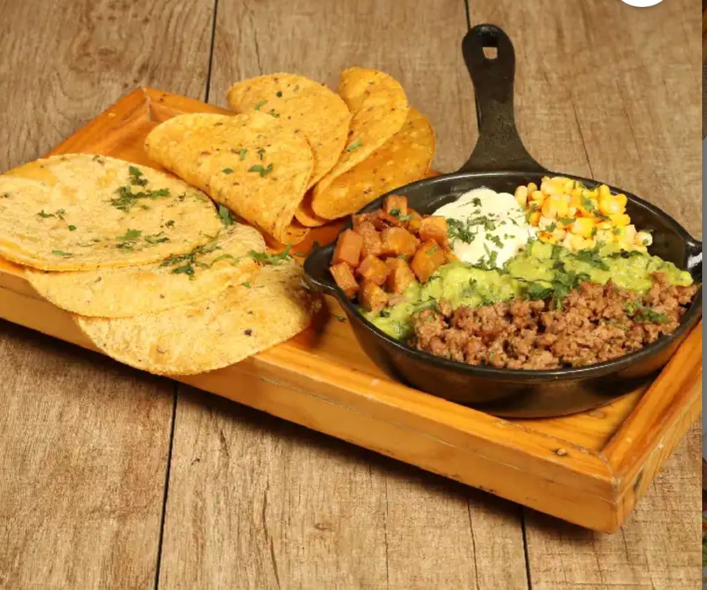 Pollo, cerdo al pastor, carne de res molida, guacamole, pico de gallo, sour cream, lechuga batavia, maíz dulce. Acompañado de totopos con cheddar, queso fresco y limon. + bebida