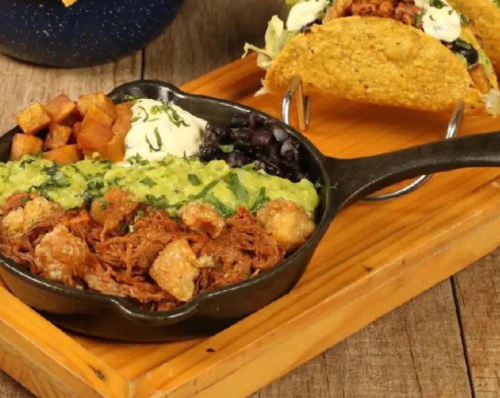 Carne de res deshebrada, salsa ranchera roja, chicharrón, maíz dulce, crema de leche y cilantro gratinado con queso mozzarella y parmesano. Acompañado de tortillas de maíz y limón.