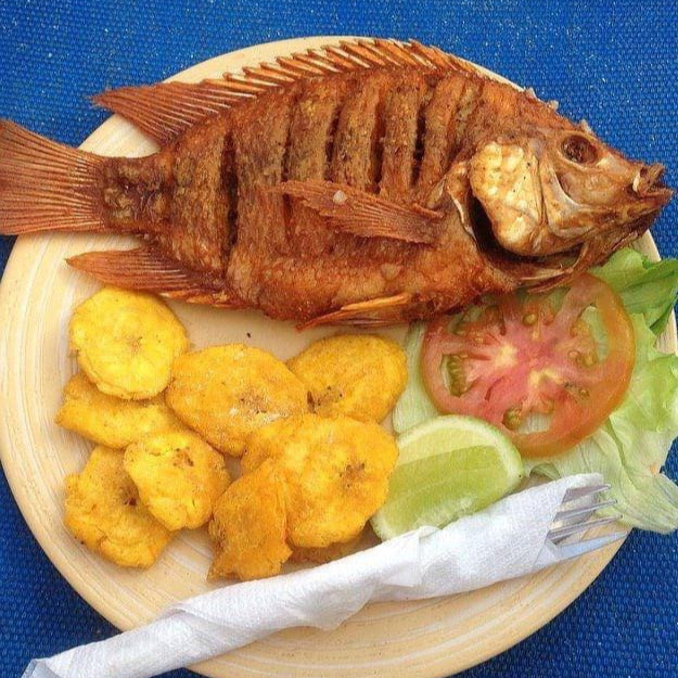 Tilapia frita acompañada de patacones y ensalada