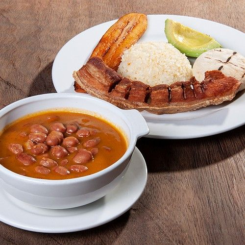 Deliciosos Frijoles con pezuña acompañados de chicharrón, arroz, tajada y aguacate.