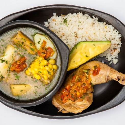 Sancocho de gallina, arroz, aguacate, presa con guiso