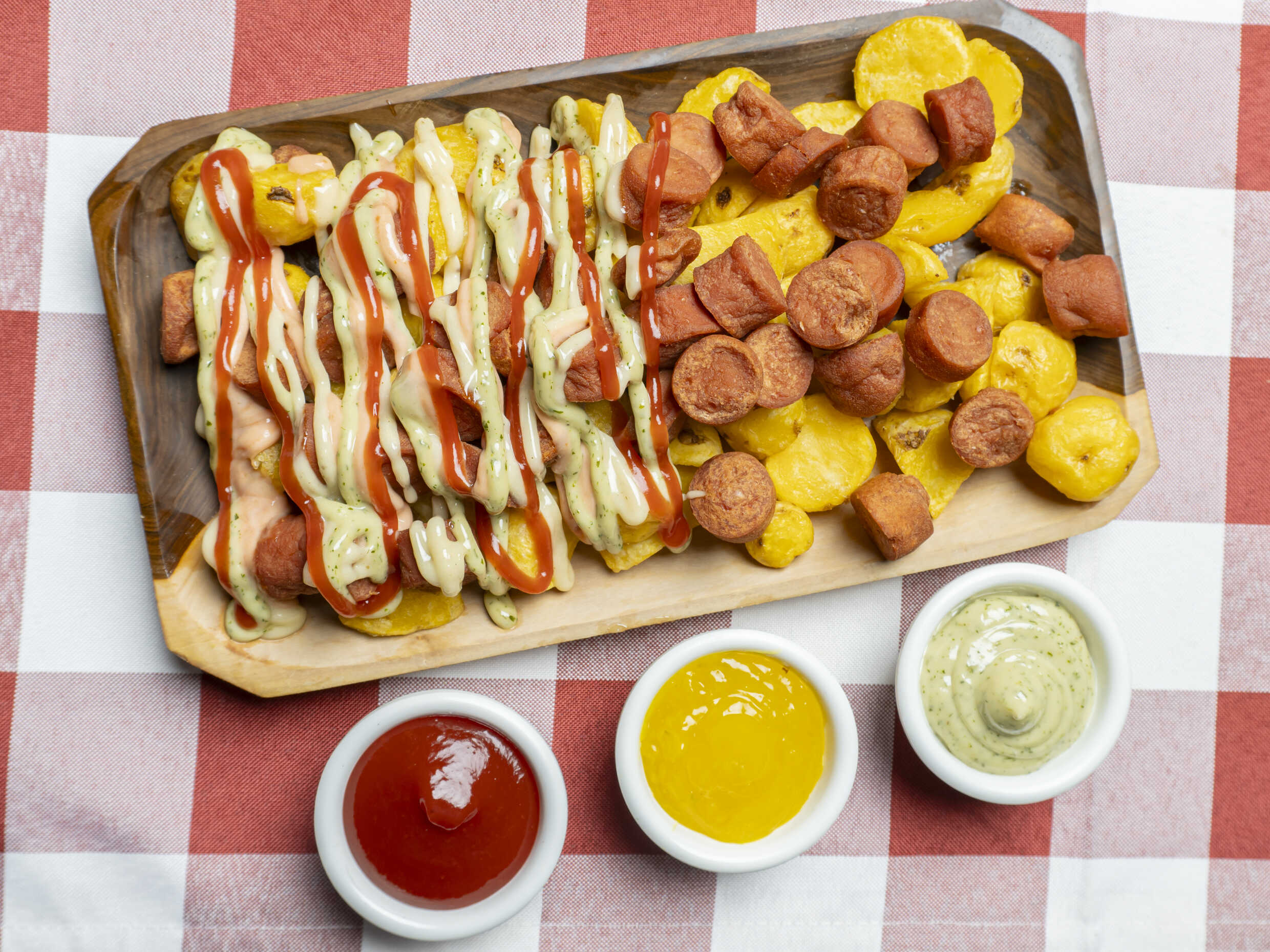 Deliciosa salchipapa de la casa, con la receta tradicional. Viene con: papa, salchicha, salsa de la casa.