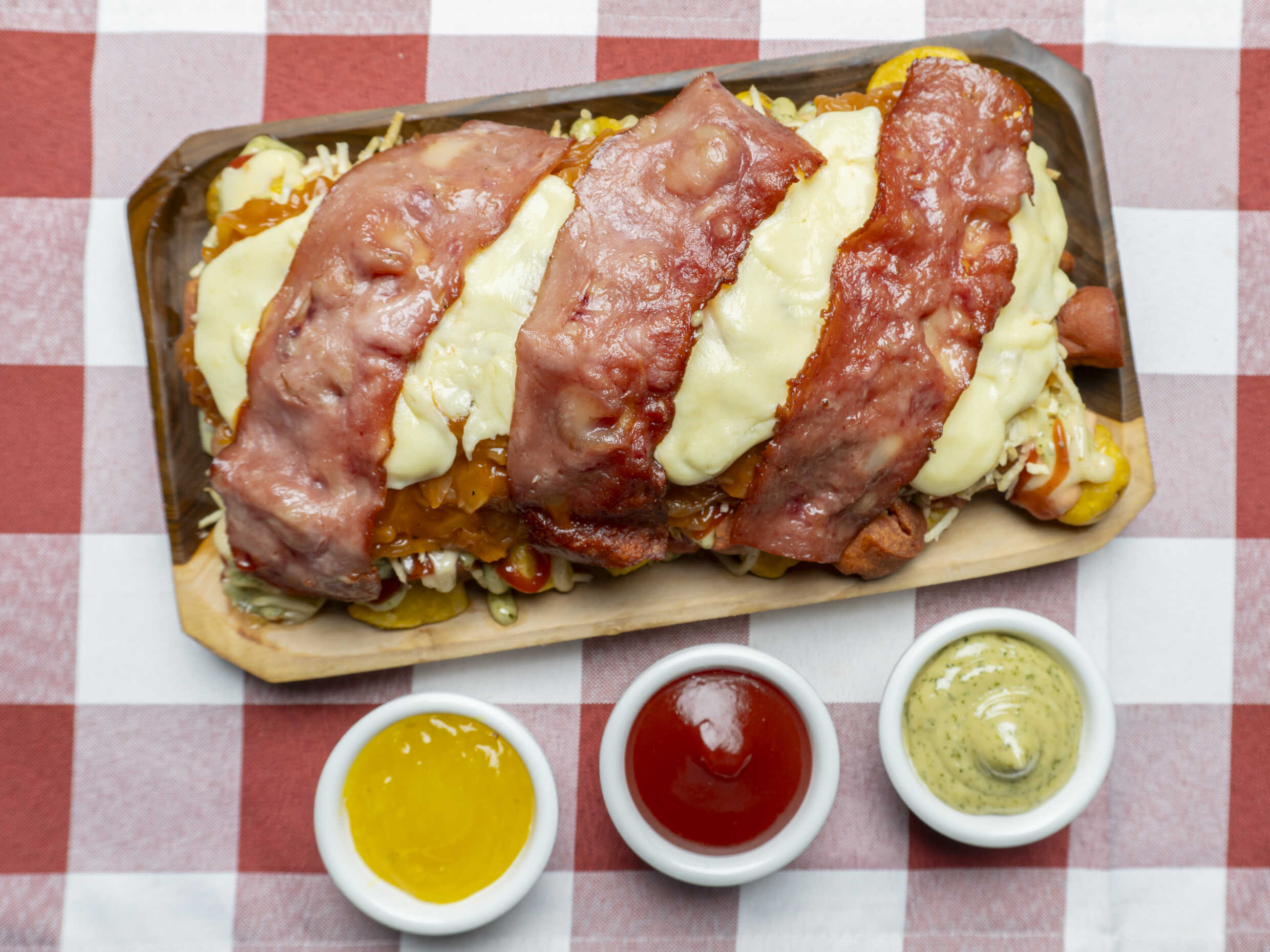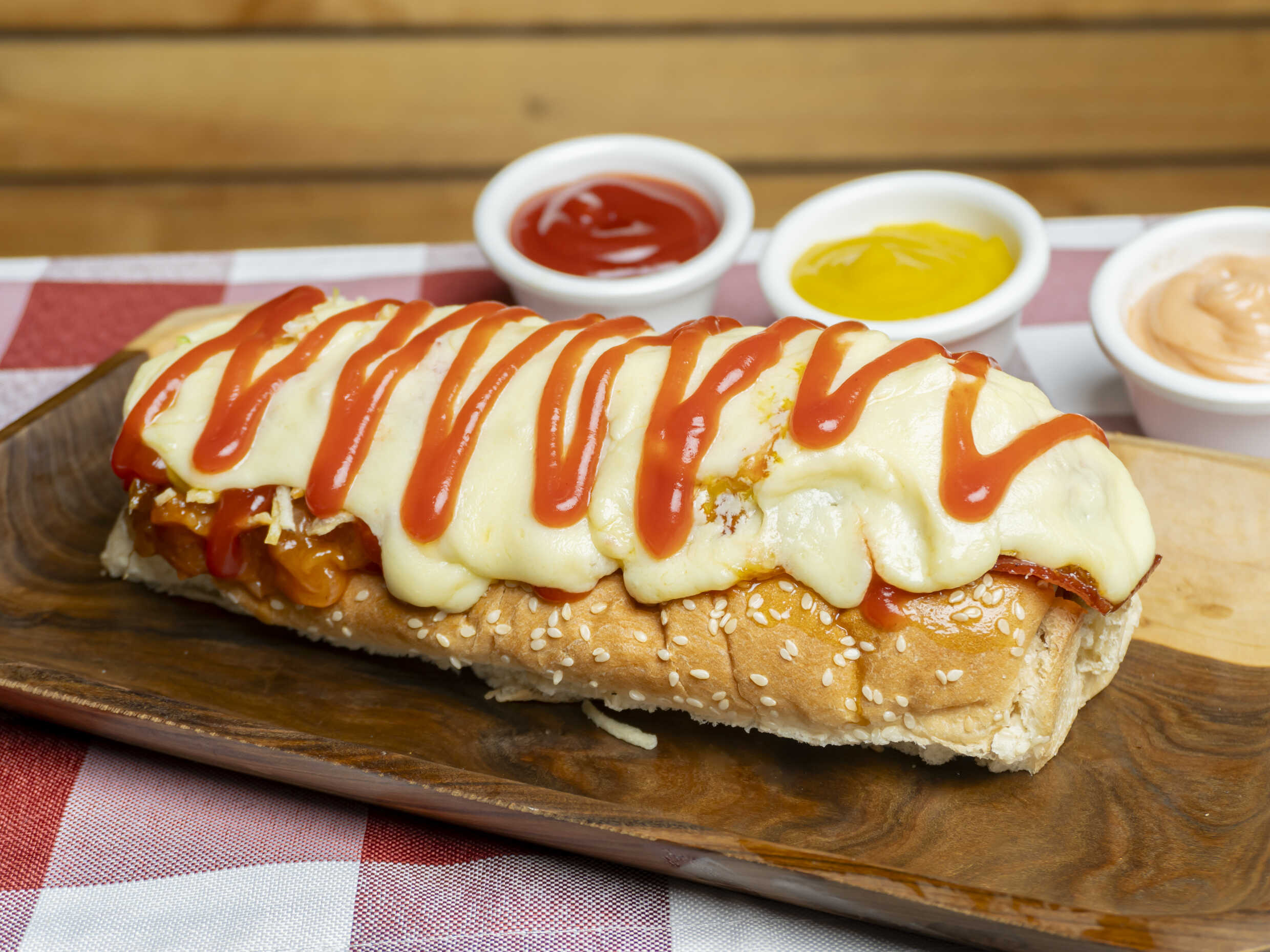 Delicioso perro caliente de la casa, con la receta tradicional. Viene con: salchicha, doble tocineta, queso, cebolla, ripio y salsa de la casa.
