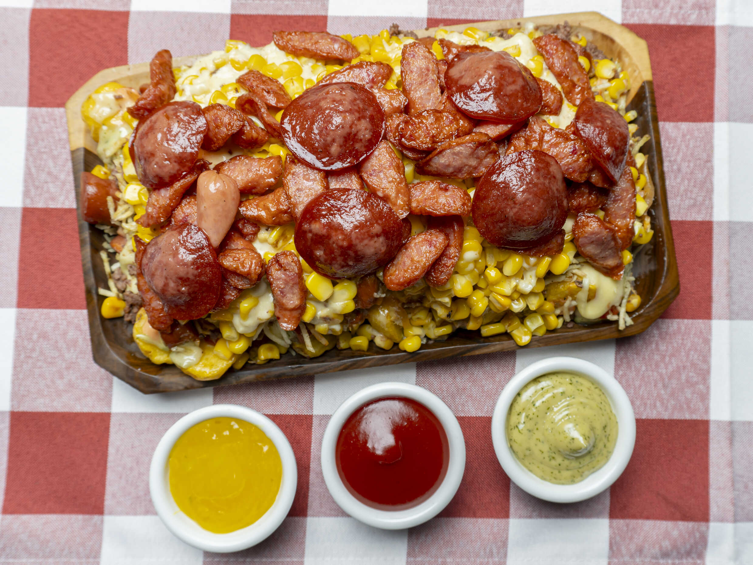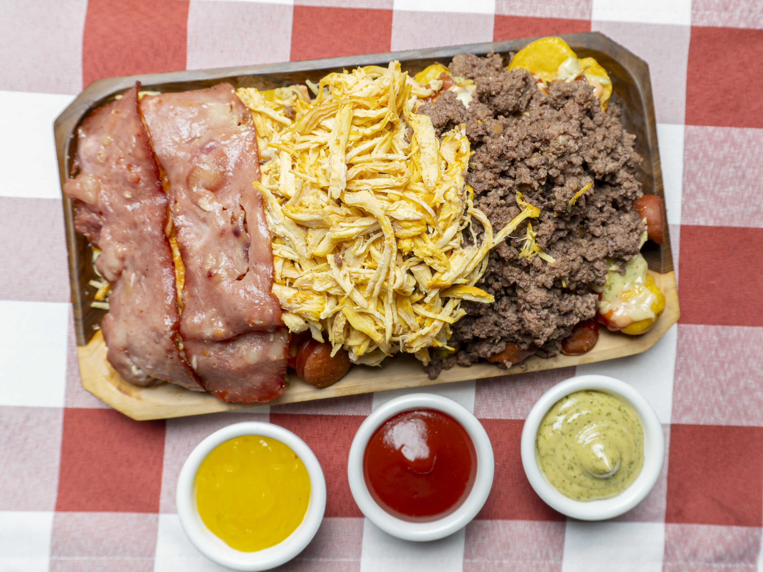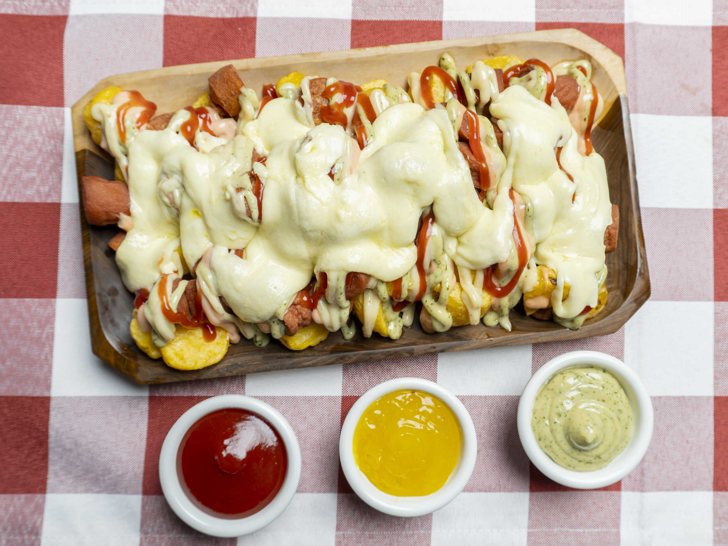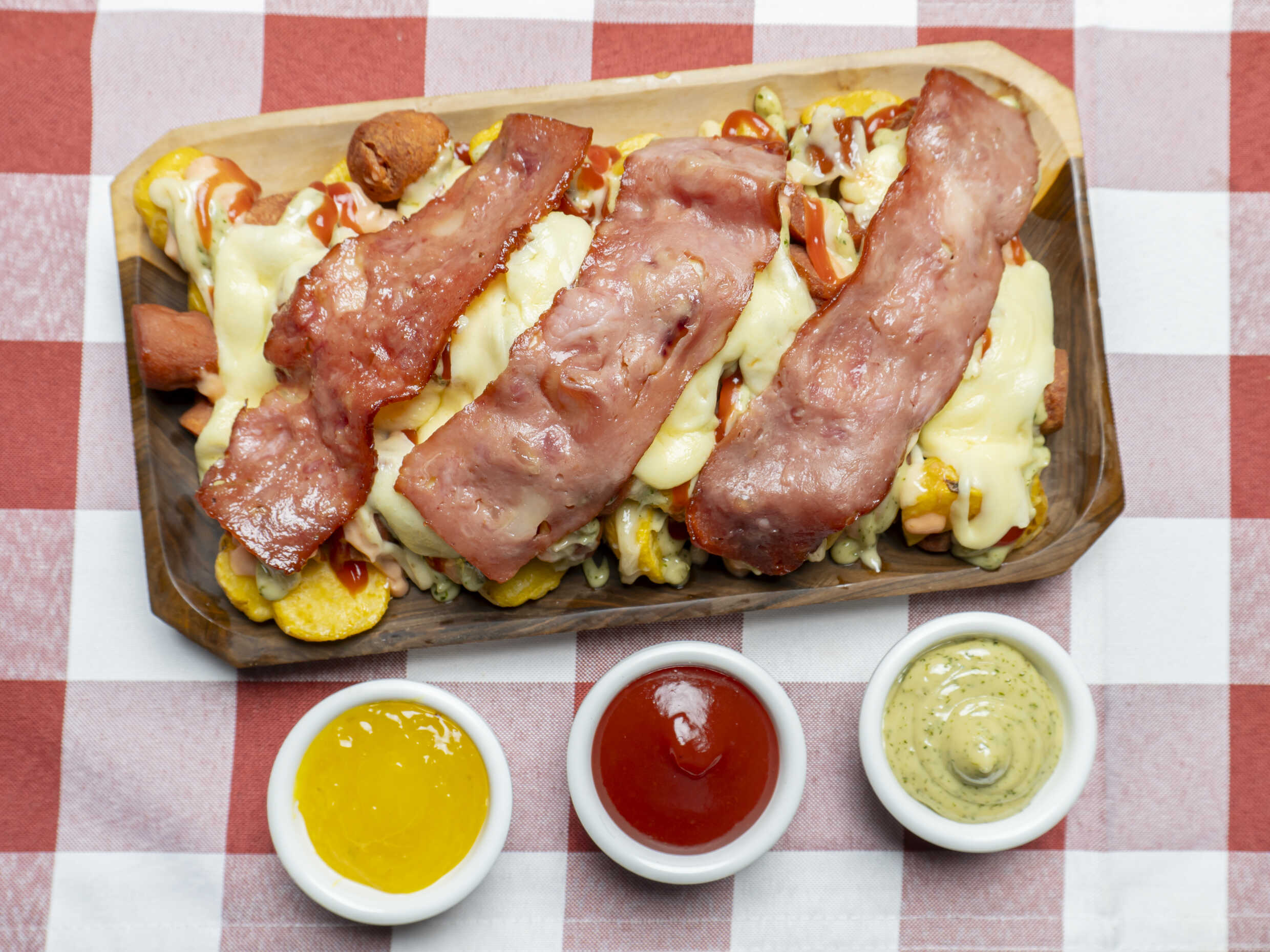 Deliciosa salchipapa de la casa, con la receta tradicional. Viene con: papa, salchicha, salsa de la casa, pollo desmechado, carne molida, tocineta y queso.