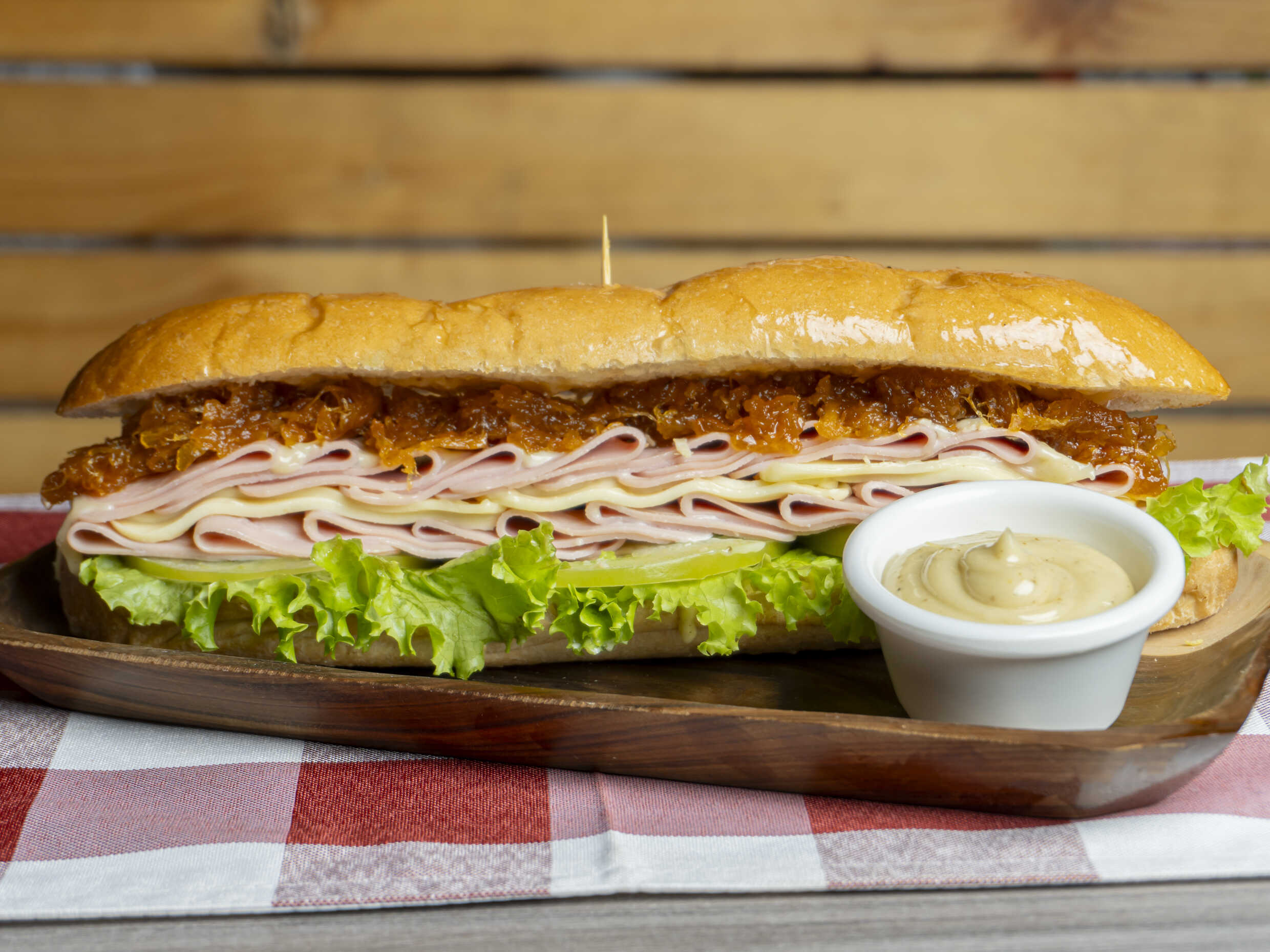 Delicioso sándwich de la casa, con la receta tradicional. Viene con: jamón, queso, piña, lechuga, tomate y salsa de ajo.
