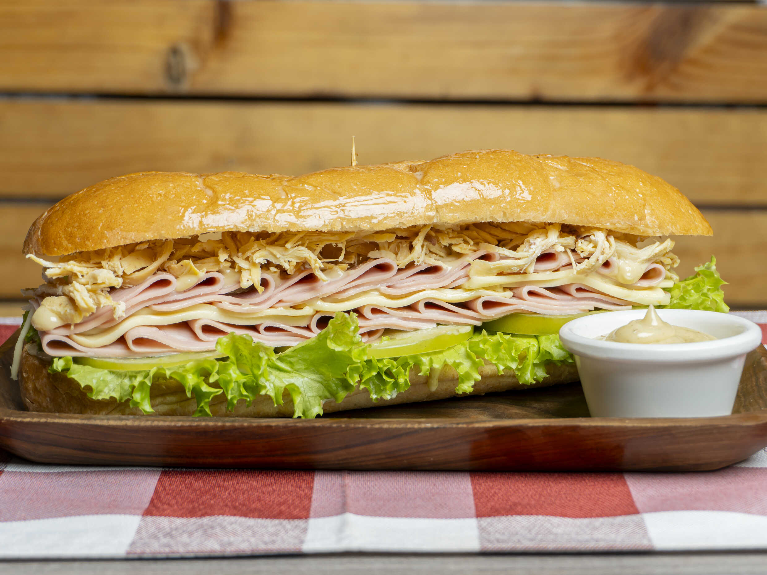 Delicioso sándwich de la casa, con la receta tradicional. Viene con: jamón, queso, pollo, lechuga, tomate y salsa de ajo.