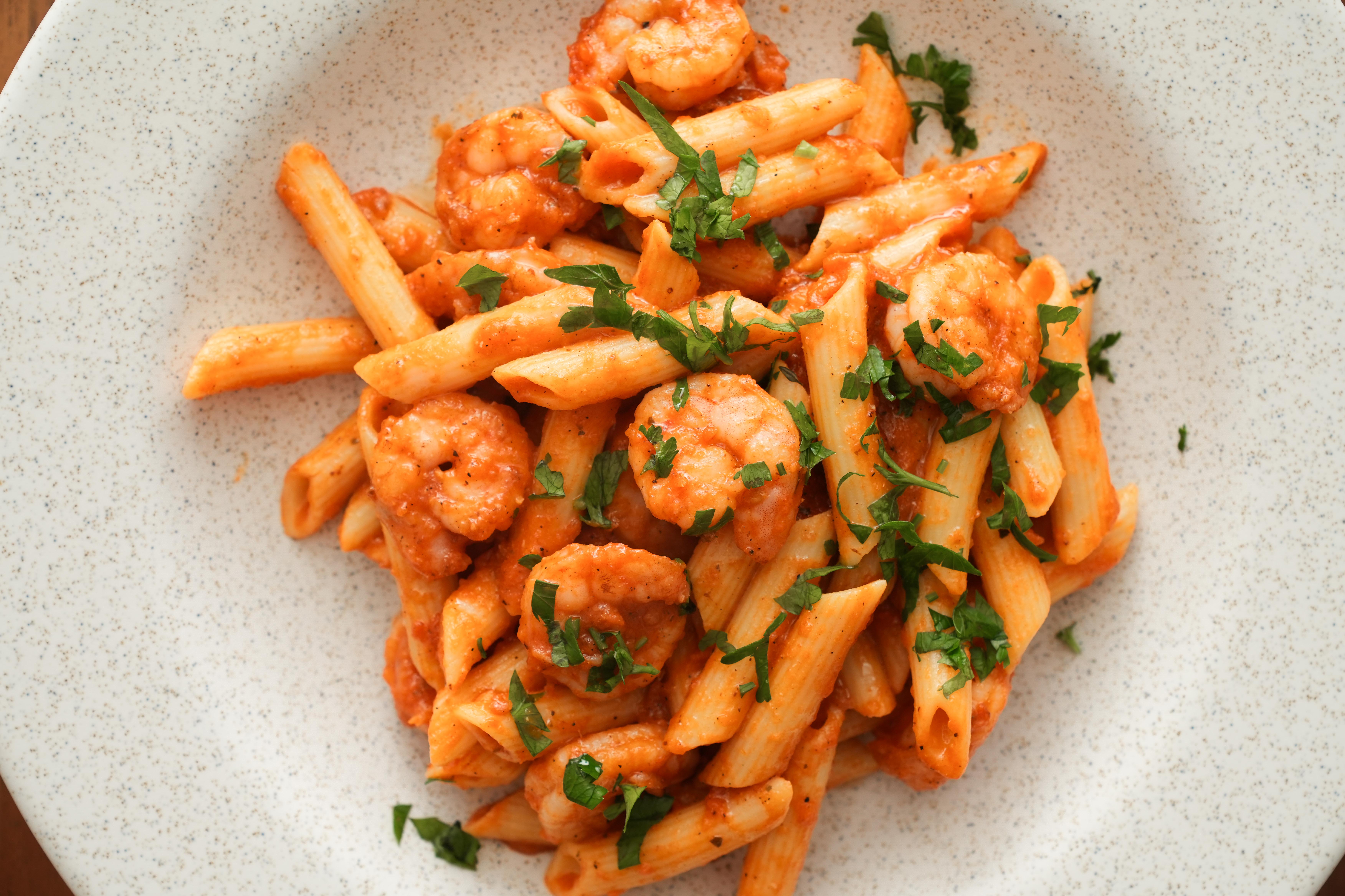 Pasta fresca con camarones perfumados en ajos rostizados, finalizados en mantequilla con salsa napolitana y crema de leche, acompañado de queso parmesano rallado y albahaca genovesa.
