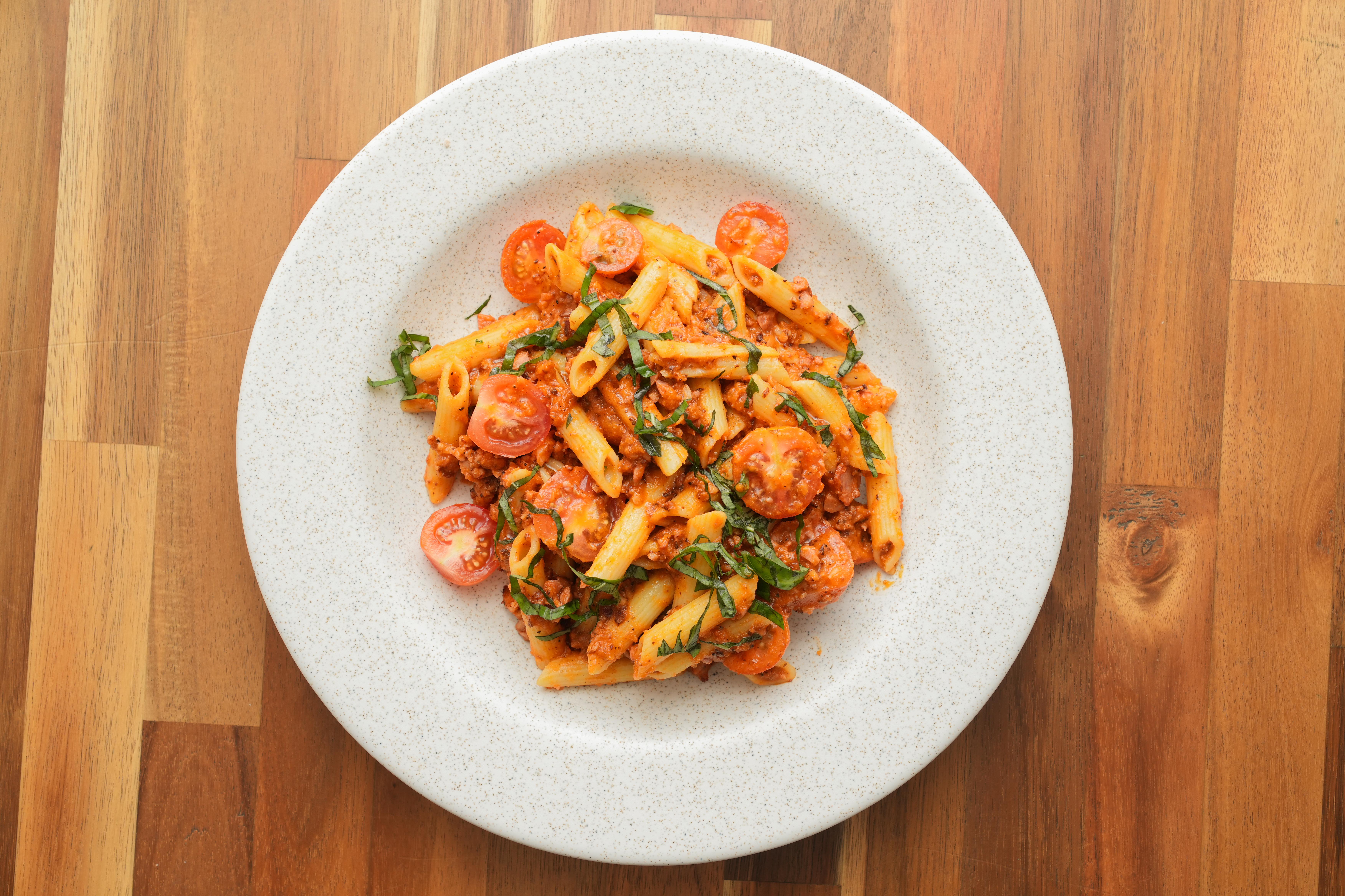 Pasta penne salteada con tocineta rostizada y hojas de albahaca fresca, finalizada en salsa napolitana con un toque de peperoncino y queso parmesano.