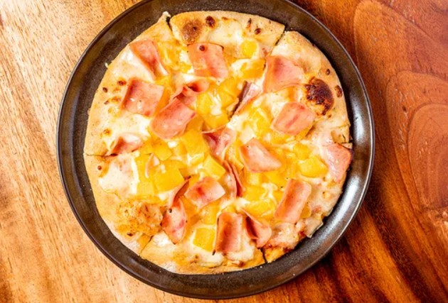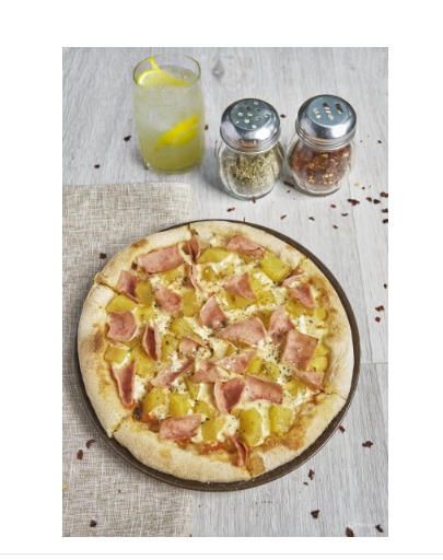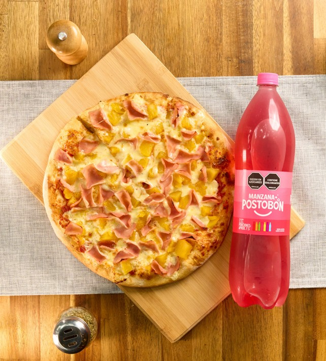 Tamaño personal 6 porciones. Ingredientes: jamón y piña. A partir del tamaño puedes elegir más de un sabor.