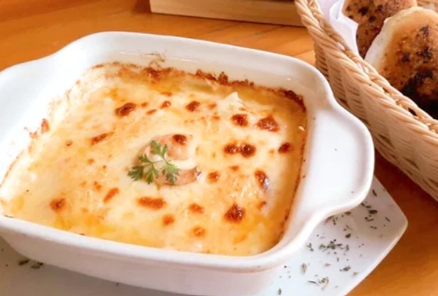 Lasagna con salsa blanca, camarones, anillos de calamar, queso mozzarella y queso parmesano gratinado.