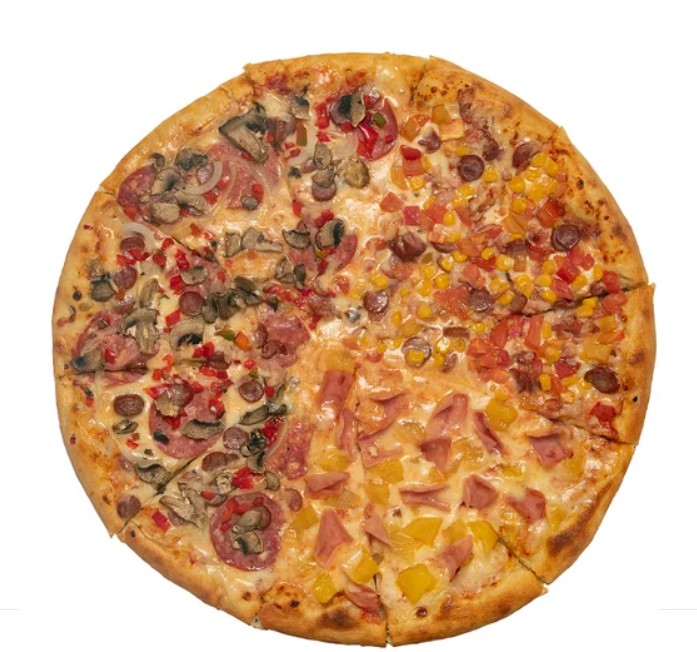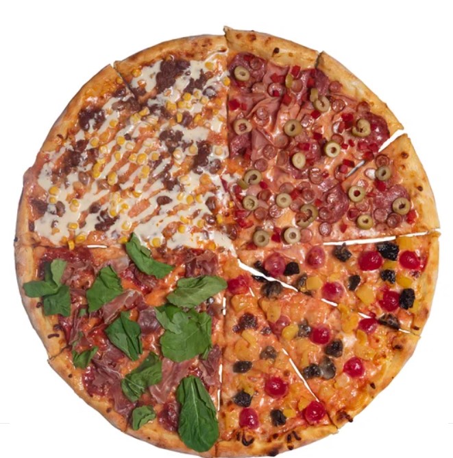 Pizza combinada de 8 porciones, se pueden combinar hasta 3 sabores, una mitad de 1 sabor y los otros dos cuartos de 2 sabores distintos.