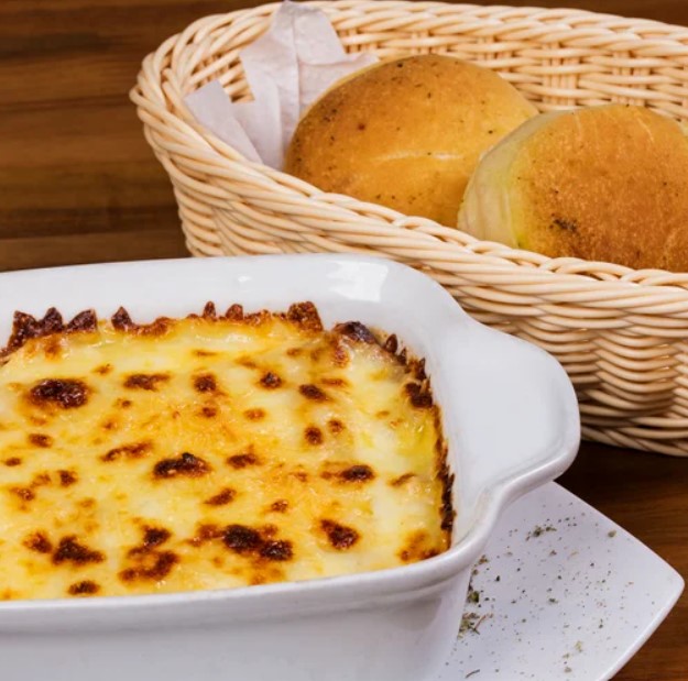 Lasagna con salsa blanca de pollo, queso mozzarella y queso parmesano gratinado. Acompañada de 2 panecillos de ajo.