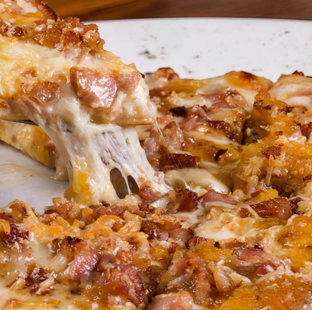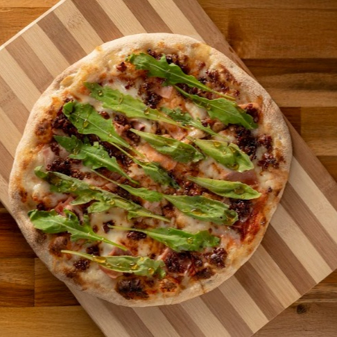 Miel picante glaseada, jamón de pierna artesanal, tocineta caramelizada, rugula inglesa queso de búfala y salsa napolitana de la casa.